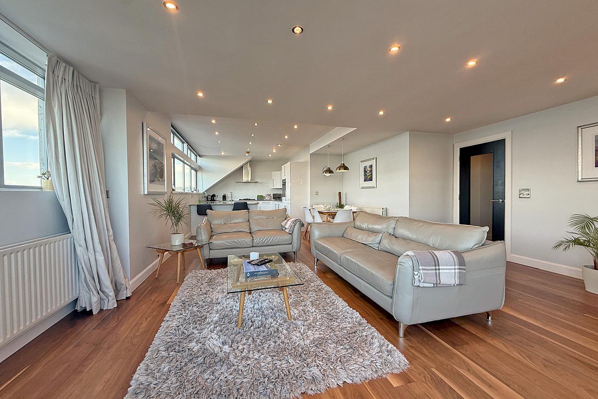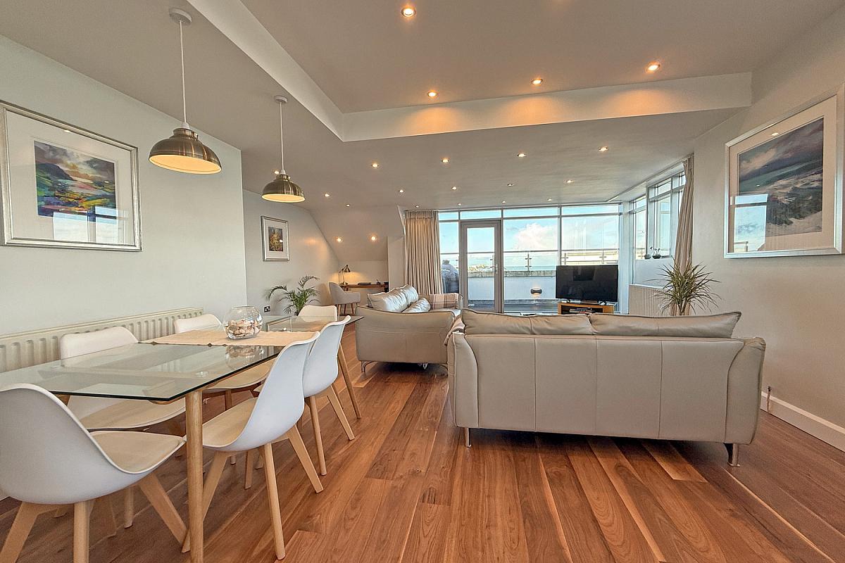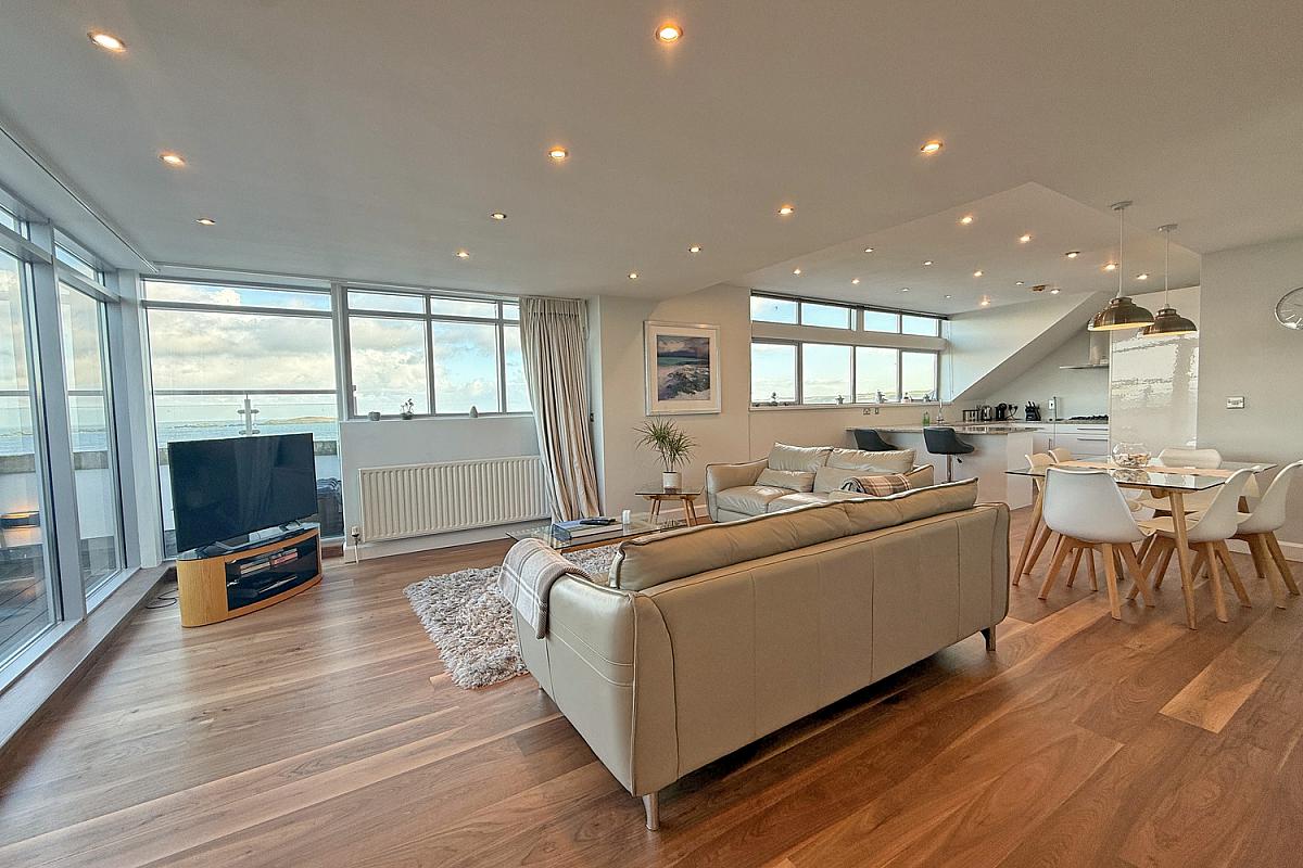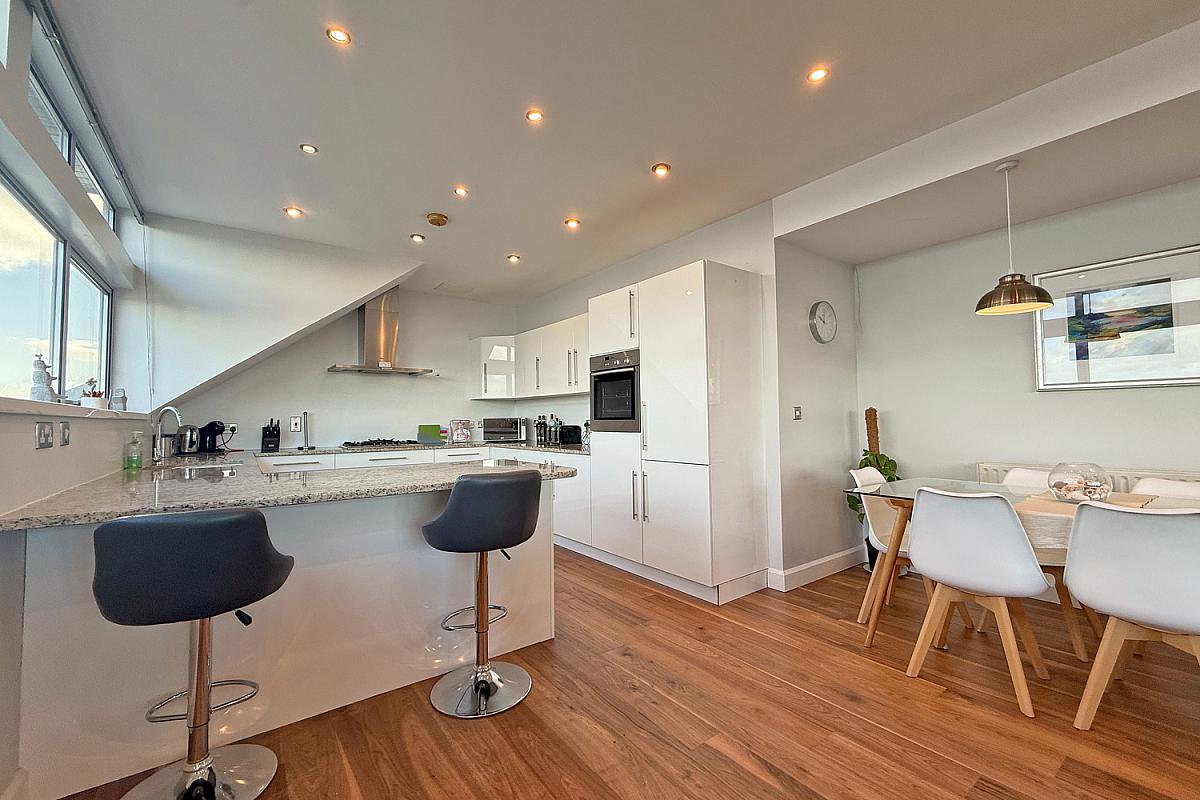The spacious open plan kitchen, living and dining area is designed for modern living and enhanced by high-quality interior finishes, contemporary detailing and abundant natural light. The well appointed kitchen includes integrated appliances, granite work surfaces and a breakfast bar with panoramic sea views.