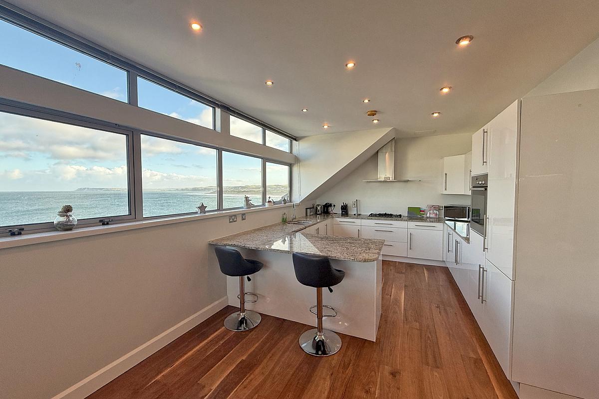 Range of fitted units; granite work surfaces; recessed sink & drainer; integrated fridge freezer & dishwasher; Neff kitchen appliances include gas hob & fitted oven; extractor unit over hob; breakfast bar seating with panoramic sea views; space for dining; open to living area.