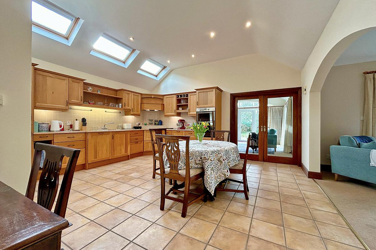 Range of high & low level units; laminate work surfaces; electric hob with extractor unit over; fitted double oven; stainless steel sink unit; integrated dishwasher and fridge; underfloor heating; tiled floor; vaulted ceiling; recessed lighting; open to living room.