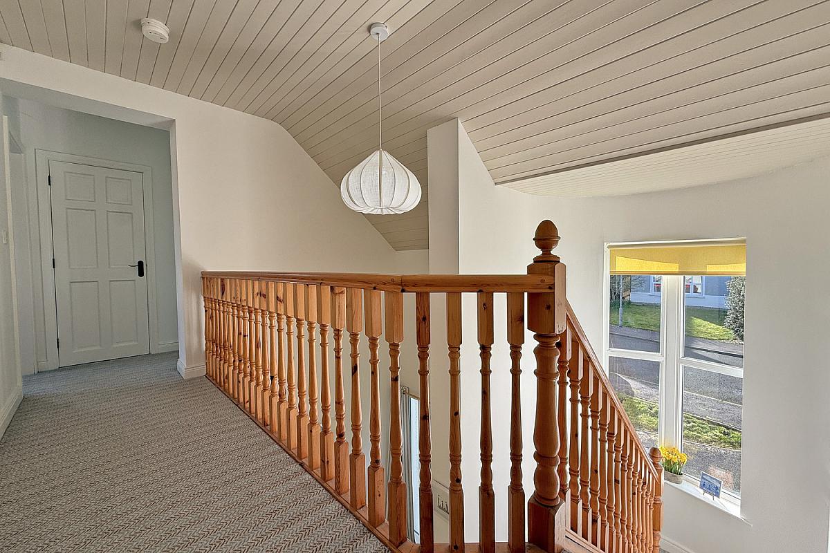 Open landing overlooking the entrance hall; painted wood panelled ceiling; shelved hot press; access to roof space.