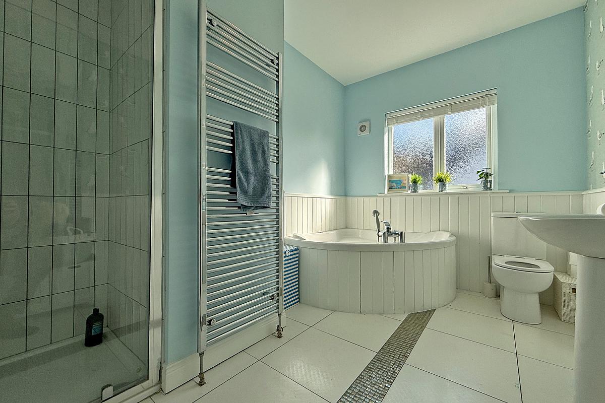 Corner spa bath; tiled shower cubicle; toilet and wash hand basin; chrome towel radiator; tiled floor; extractor fan.