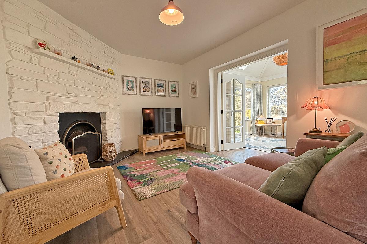 Attractive featured cast iron fireplace set against a painted stone wall with a slate hearth; engineered wood flooring; glass-panelled doors leading to sun room.