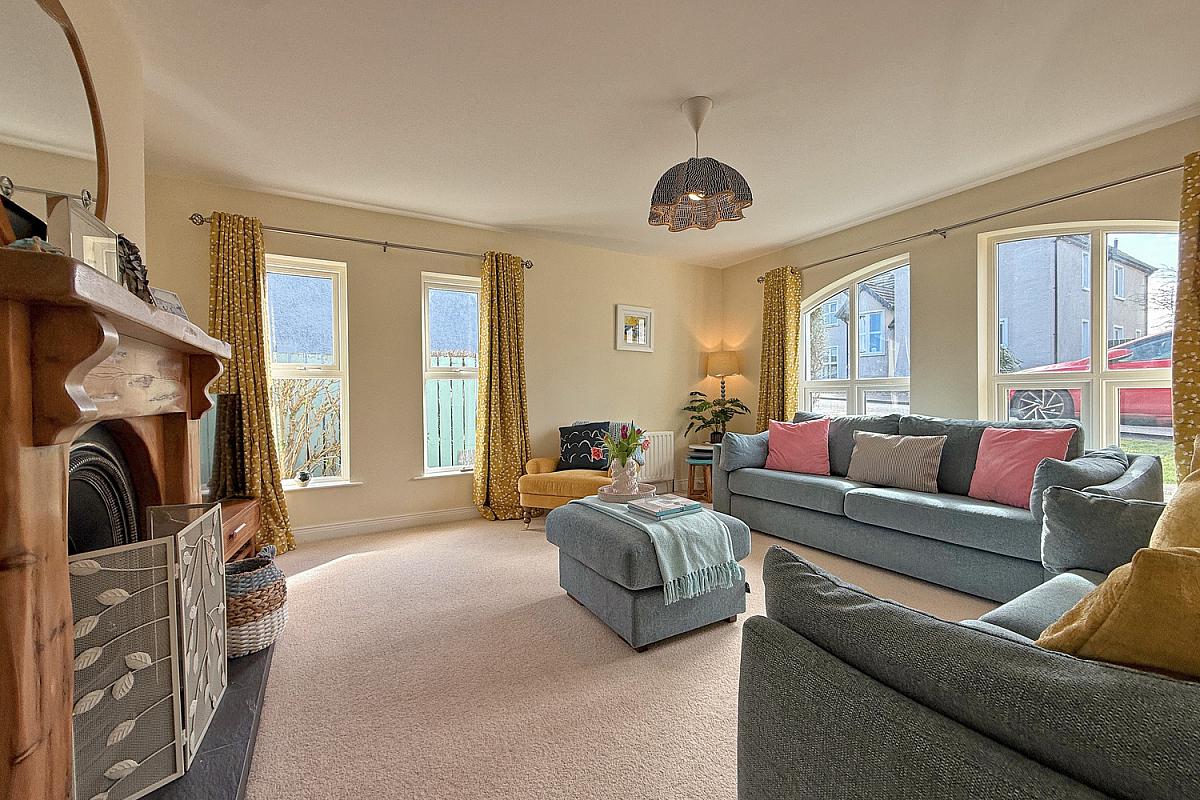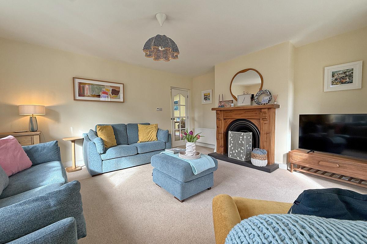 Bright and spacious lounge with front-facing box bay; gas fire set within a cast iron fireplace with wood surround and tiled hearth.