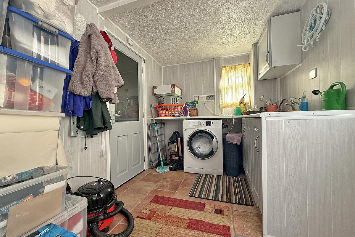 Range of fitted units; laminate work surfaces; stainless steel sink & drainer; plumbed for washing machine; space for dryer & fridge freezer; tiled floor; door to the integral garage & rear garden.