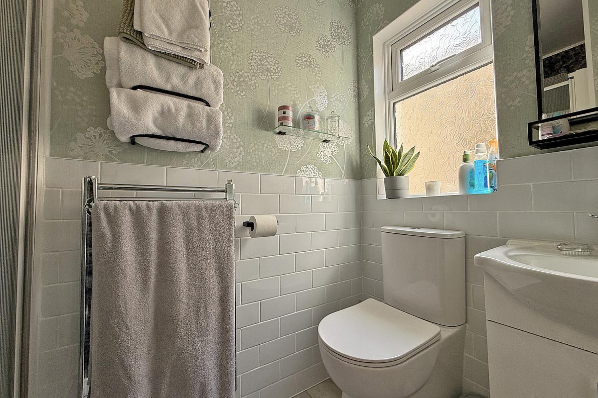 Panelled shower cubicle with electric shower; toilet; vanity unit with wash hand basin; chrome towel radiator; part tiled walls; Amtico flooring.