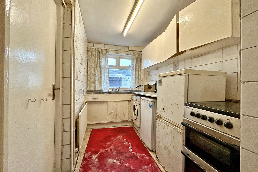 Range of fitted units; stainless steel sink & drainer; space for cooker & fridge freezer; plumbed for washing machine; tiled walls; vinyl floor; door to the rear.