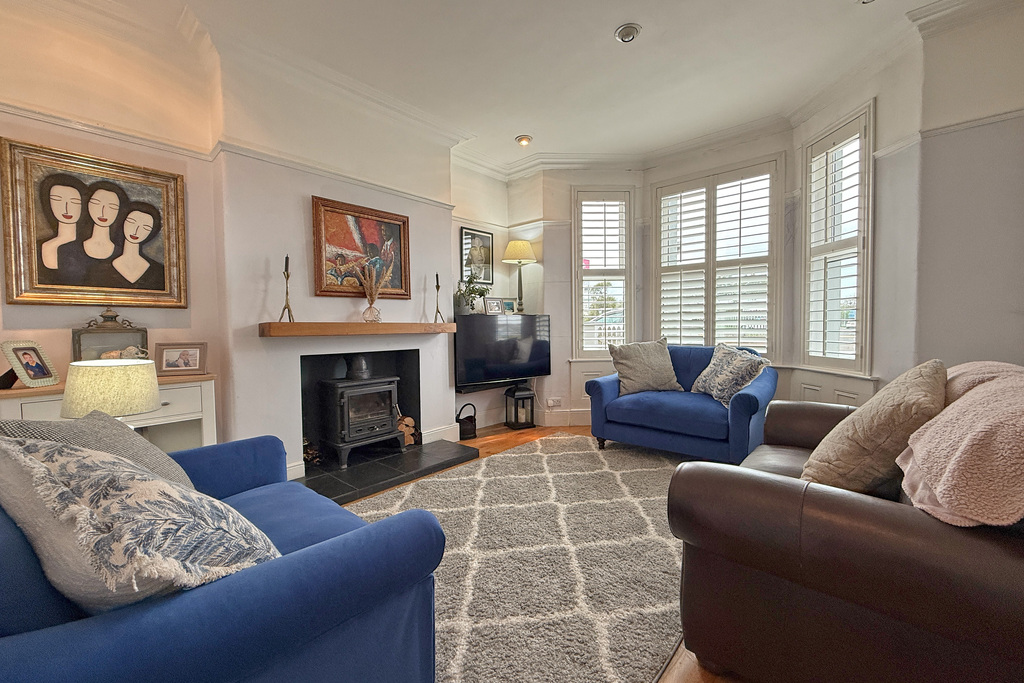 Bay window to the front with plantation shutters; Firefox multi fuel stove set on a tiled hearth with a wooden mantle; solid wood floor.