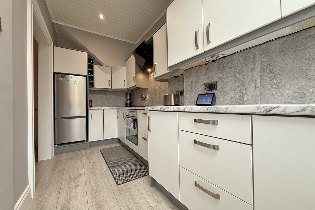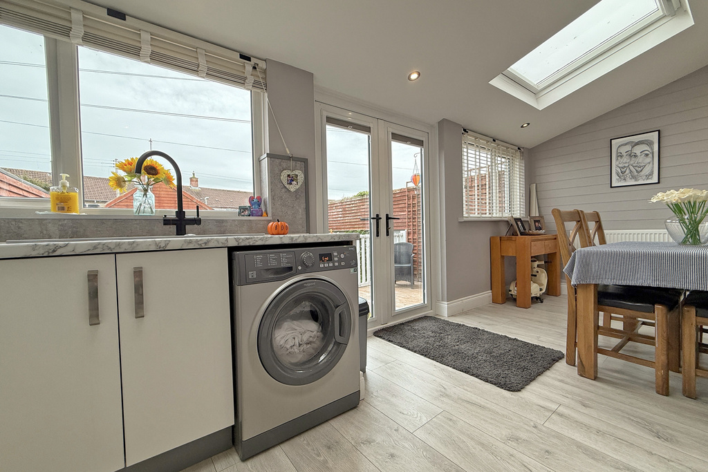 Range of fitted units; laminate work surfaces; recessed sink & drainer; electric oven & hob with extractor unit over; space for fridge freezer; plumbed for washing machine; part panelled walls; recessed lighting; laminate floor; open to dining area.