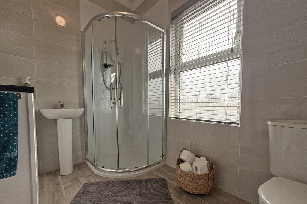 Panelled shower cubicle with electric shower; toilet; wash hand basin; part tiled walls; wood effect tiled floor.