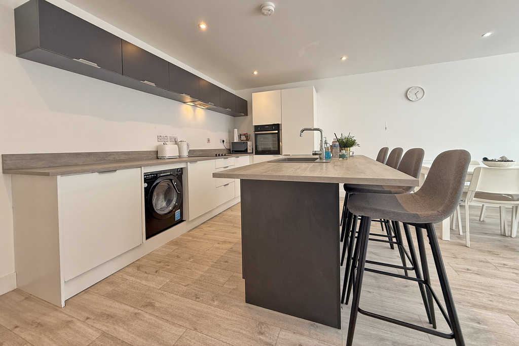 Range of high & low level units; laminate work surfaces; integrated fridge/freezer and dishwasher; space for washer/dryer; fitted oven; electric hob with extractor over; island with sink and breakfast bar seating.