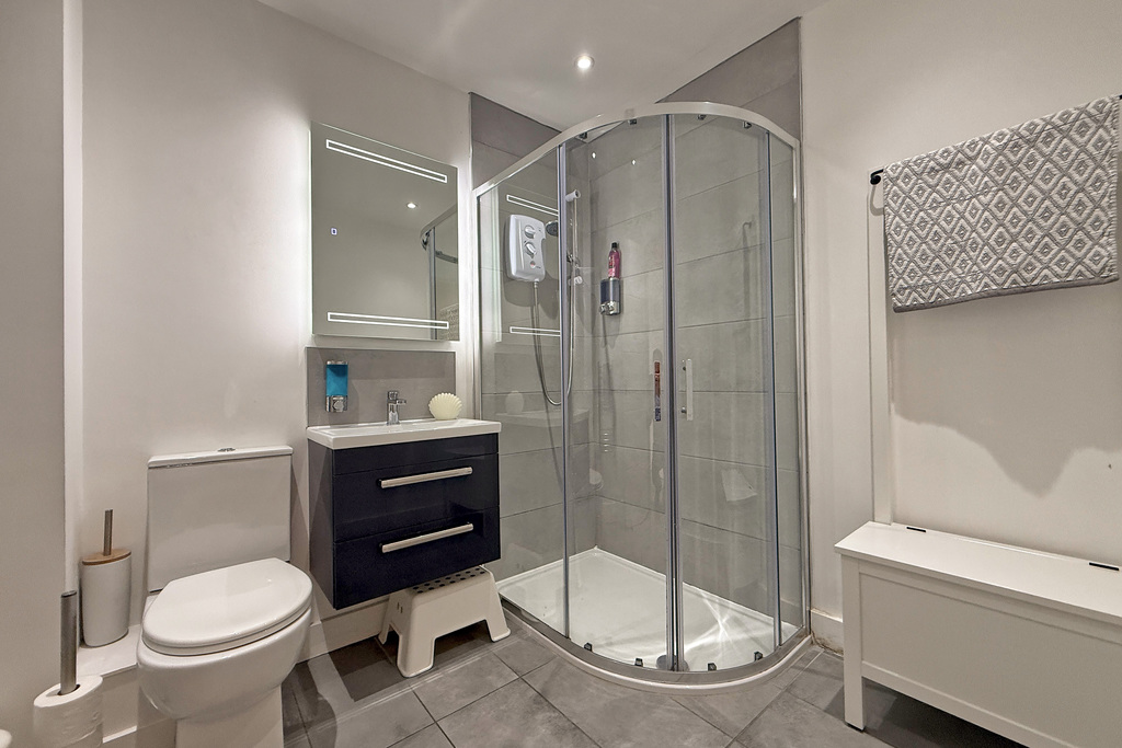 Tiled shower with electric shower; wall-mounted vanity unit with wash hand basin; toilet; electric towel radiator; tiled floor; recessed lighting.