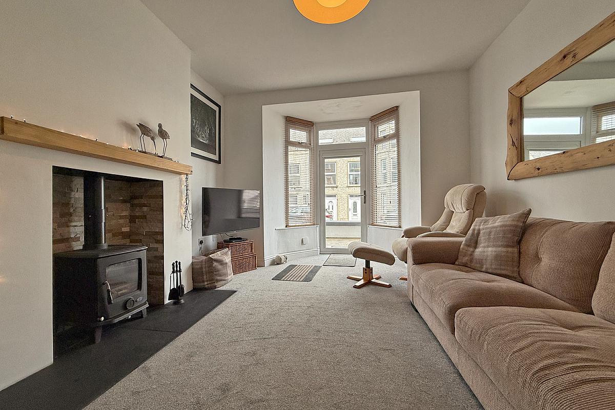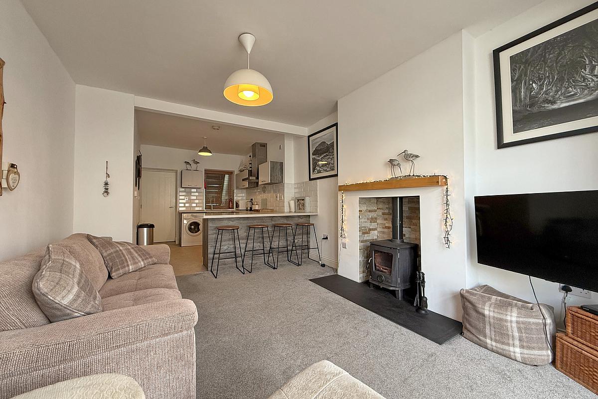 Bay window and door to the front; freestanding multifuel stove set on a slate hearth.