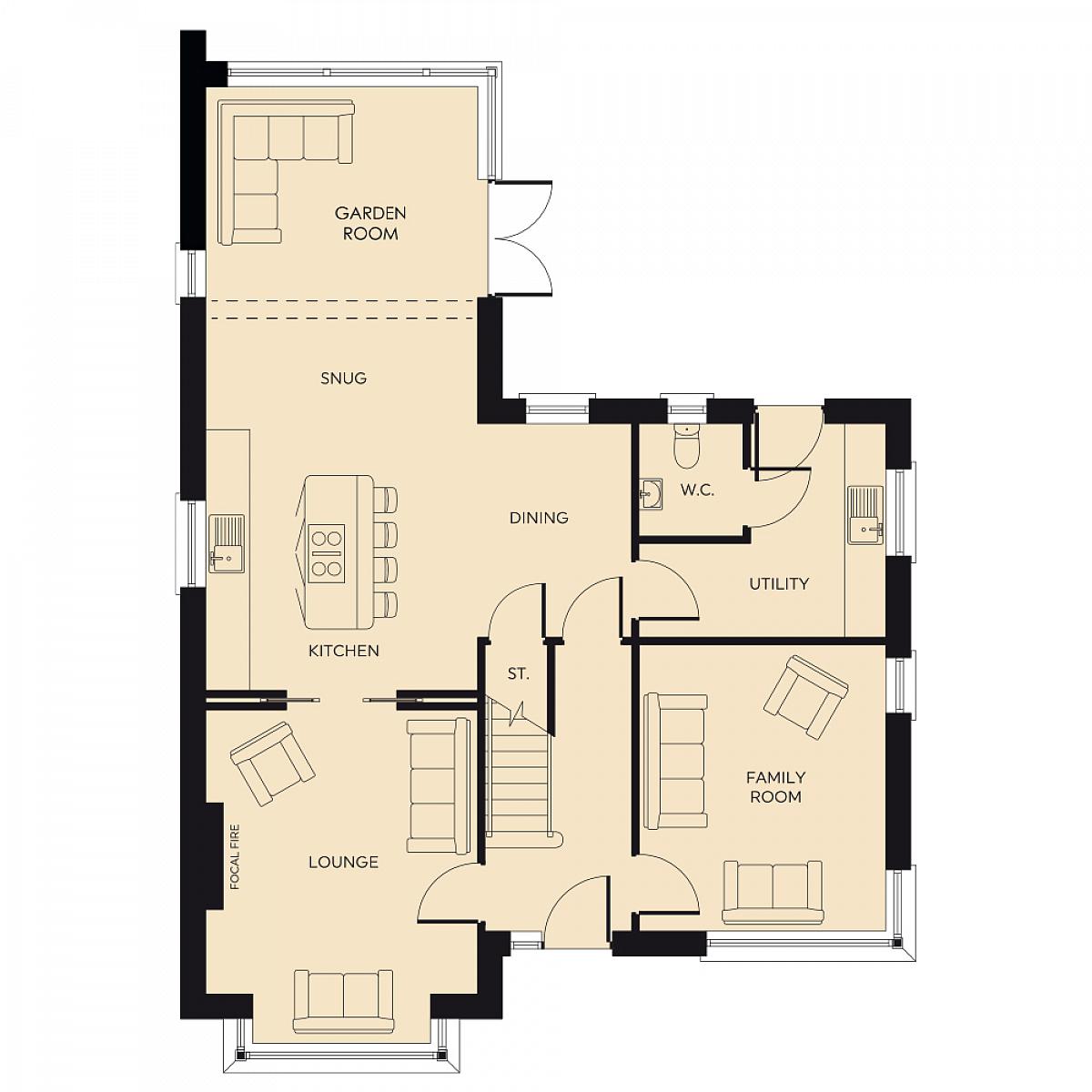 The Fisher is a spacious four-bedroom family home offering flexible living across two floors. Featuring a large open-plan kitchen, dining and snug area with direct access to the garden room, alongside two additional reception rooms, it provides the perfect balance of family space and modern design. A detached garage completes this well-proportioned home.