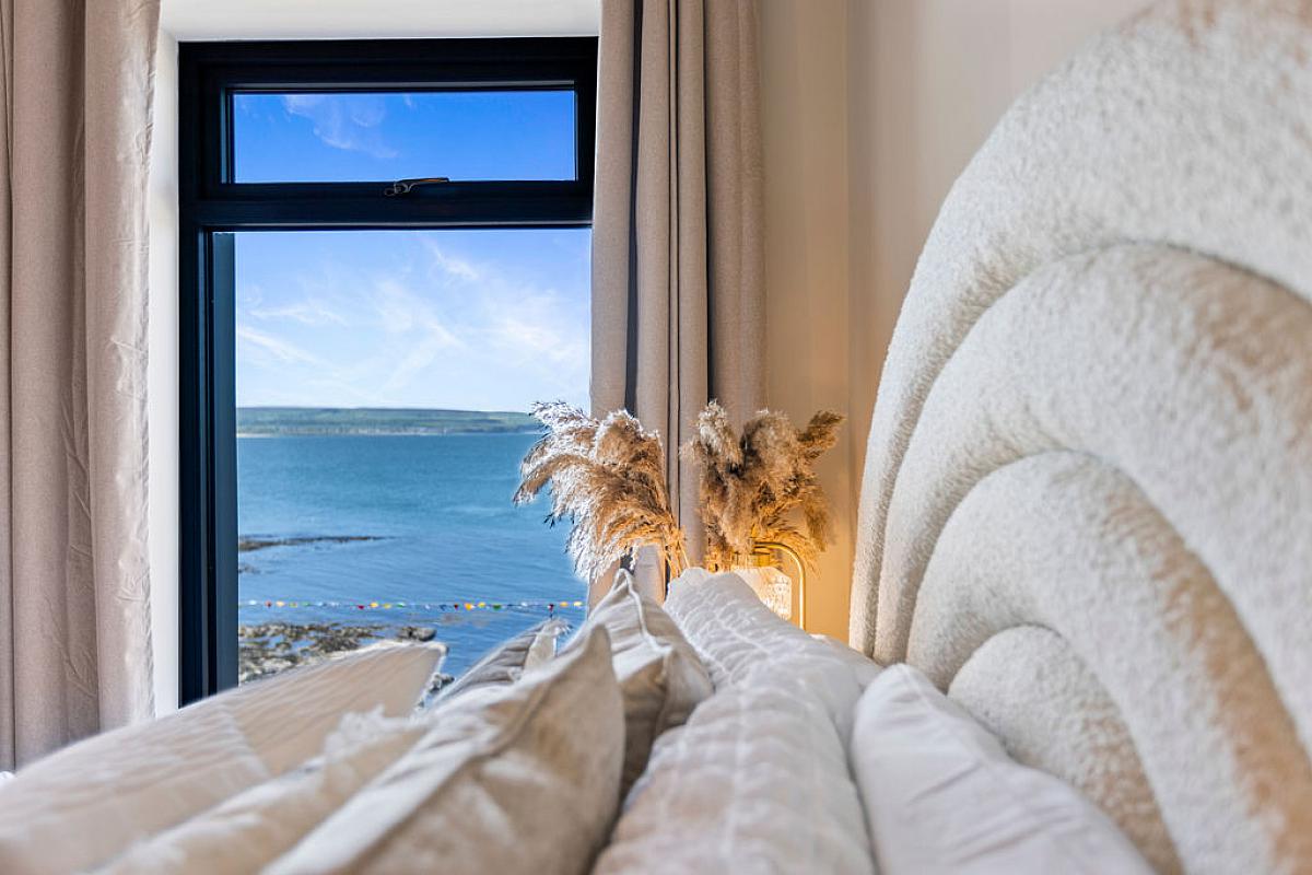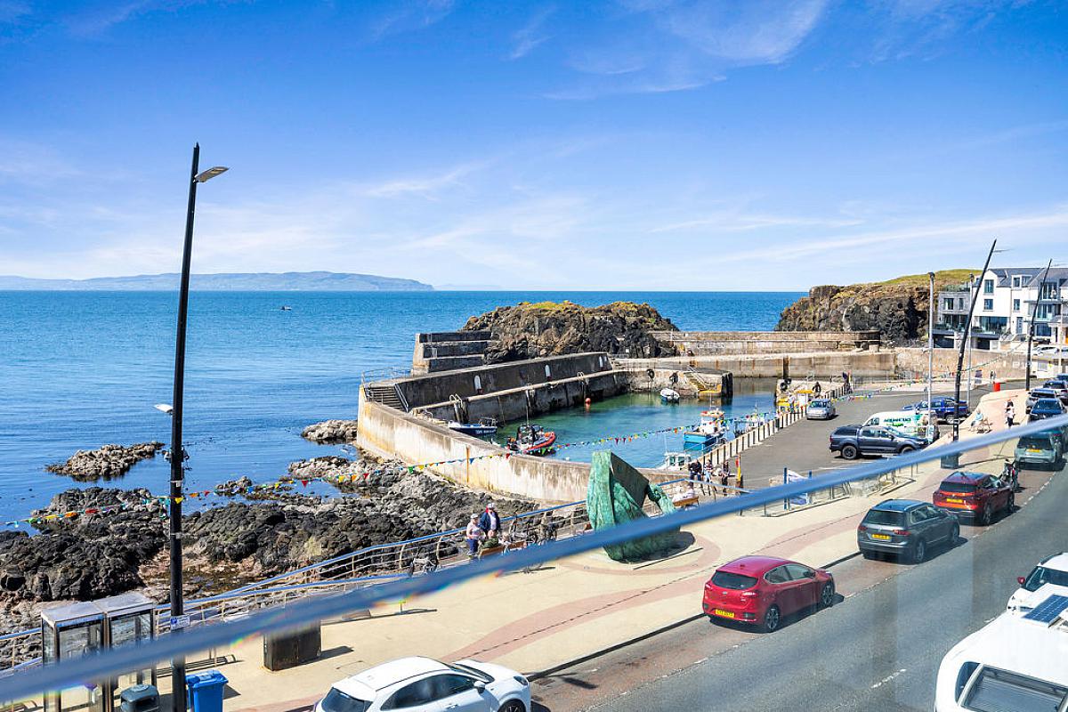 With built in furniture consisting of drawers, cupboard housing gas boiler, recessed lighting and sliding patio doors leading to large composite balcony with glass balustrades with uninterrupted views of Atlantic Ocean, Dominican Covent, Portstewart Promenade, Donegal Headlands and Harbour.