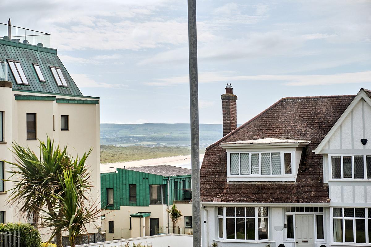 With single drainer sink unit set in 'Silestone' worktops with Quooker tap, high and low level built in units with tiling between, integrated double eye level oven, integrated dishwasher and fridge freezer, matching 'Silestone' worktop on breakfast bar with ceramic 'Bora' hob with concealed extractor fan, saucepan drawers, recessed lighting, tiled floor and PVC sun fold doors with partial beach and sea views.