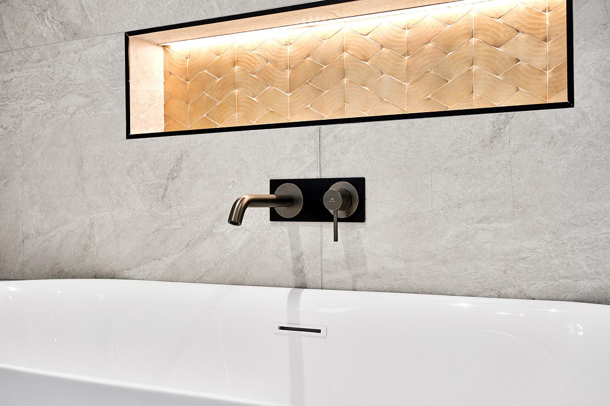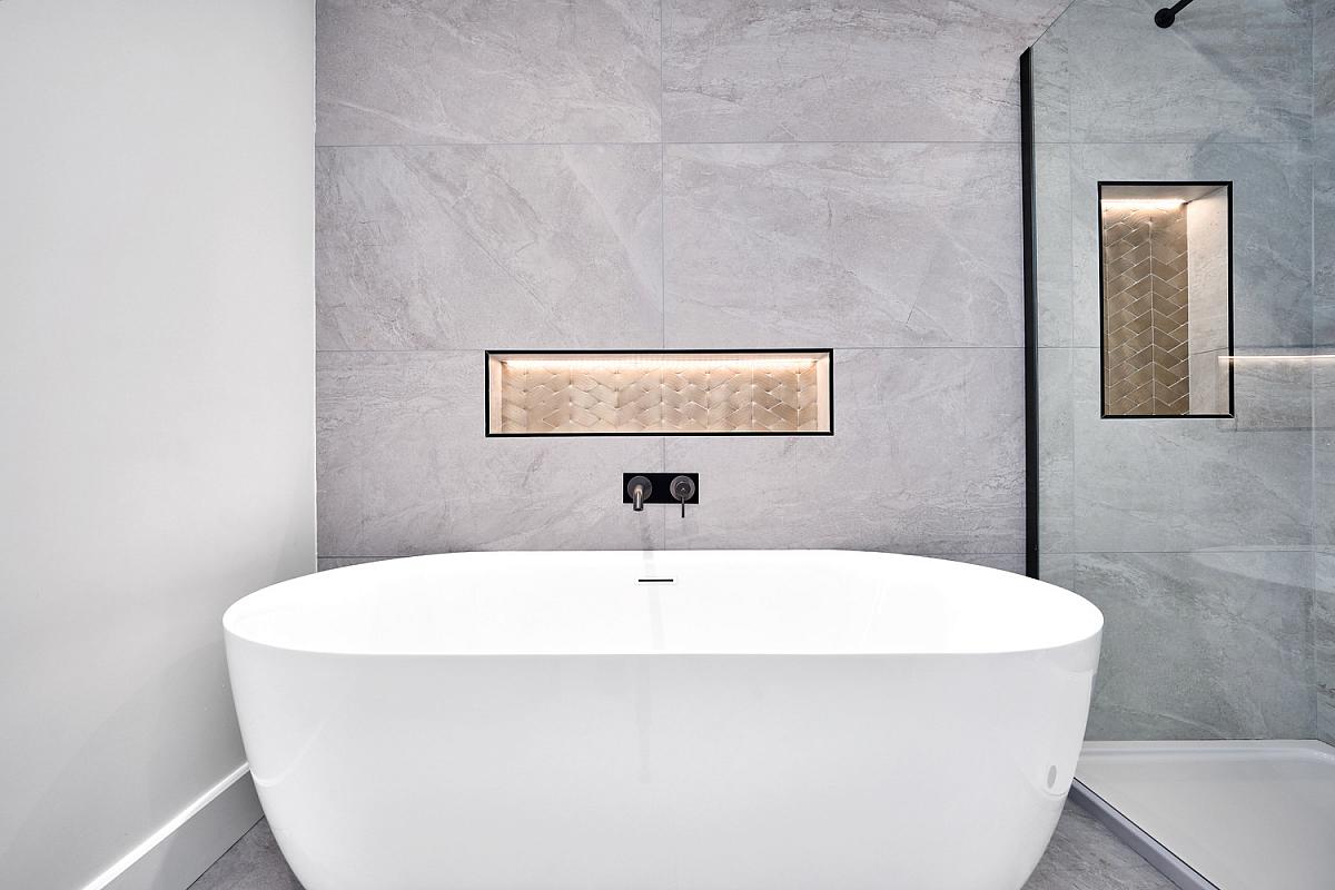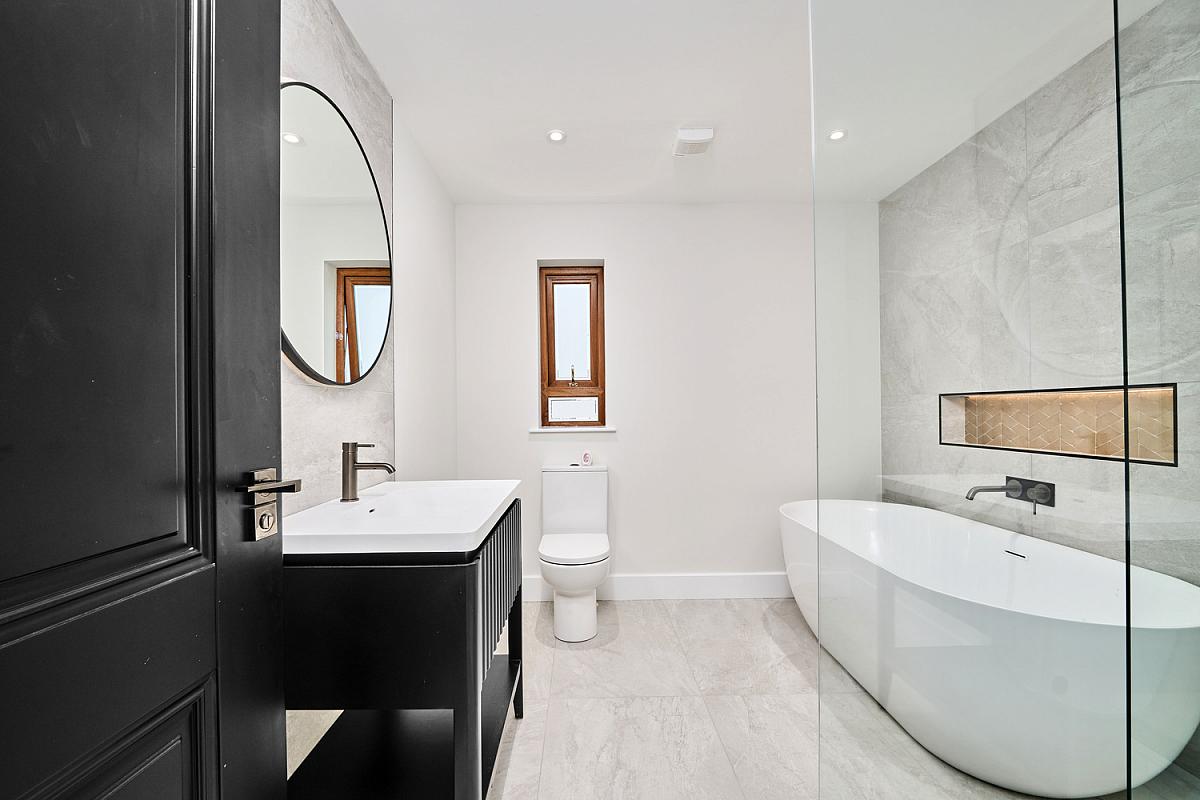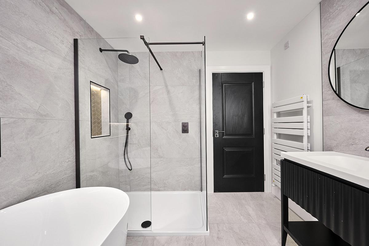 With white suite comprising w.c., wash hand basin with tiled surround, storage below and illuminated mirror above, large fully tiled walk in shower cubicle with mains matt black rainfall shower head, additional matching telephone hand shower, tiled recessed shelf, additional tiled recessed shelf, free standing bath, heated towel rail, extractor fan, recessed lighting and tiled floor.