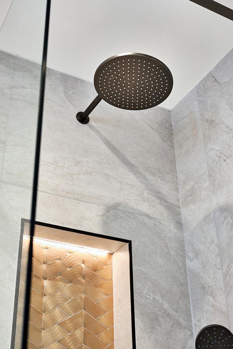 Ensuite off with w.c., wash hand basin with storage below, fully tiled walk in shower cubicle with mains rainfall shower head, additional matching telephone hand shower, illuminated recessed tiled shelf, additional recessed illuminated shelving, heated towel rail, recessed lighting, extractor fan and tiled floor.