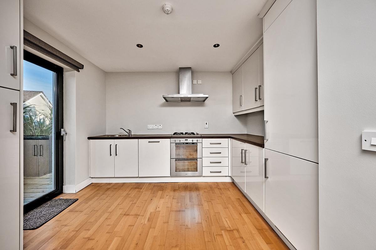With stainless steel circular sink unit with glass splashback, integrated fridge freezer, 4 ring gas hob, space for oven, stainless steel extractor fan above, integrated dishwasher, integrated fridge freezer, drawer bank, recessed lighting, solid wood floor and pedestrian door leading to decked area.