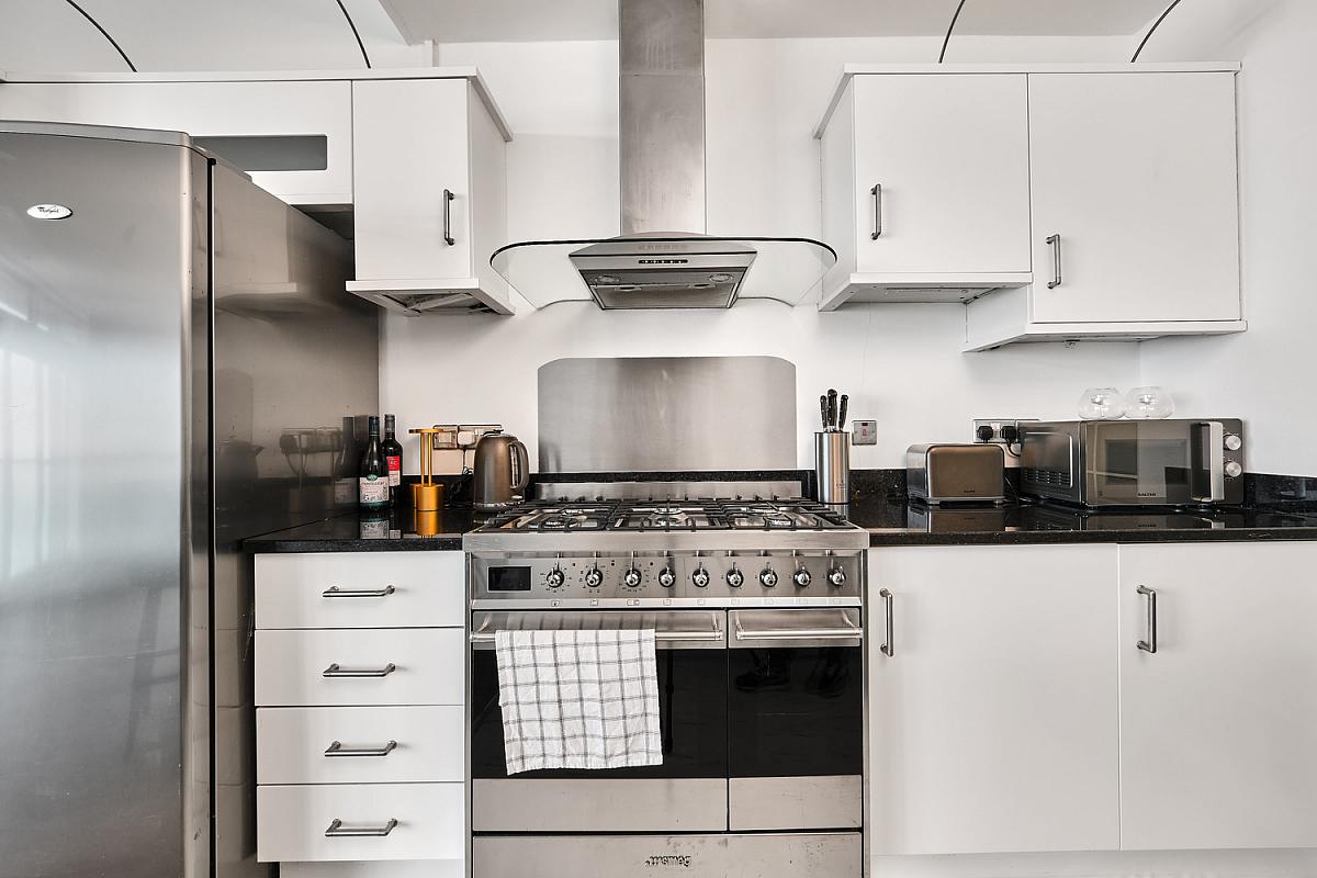 With circular bowl and half circular stainless steel sink unit set in granite worktop, high and low level built in units with tiling between, granite breakfast bar with seating for multiple people, space for gas 'Smeg' range, stainless steel splashback and extractor fan above, space for American style fridge freezer, integrated dishwasher and washing machine, drawer bank, over head storage, over unit lighting and recessed lighting.