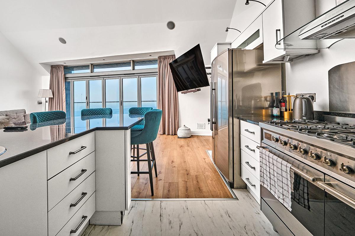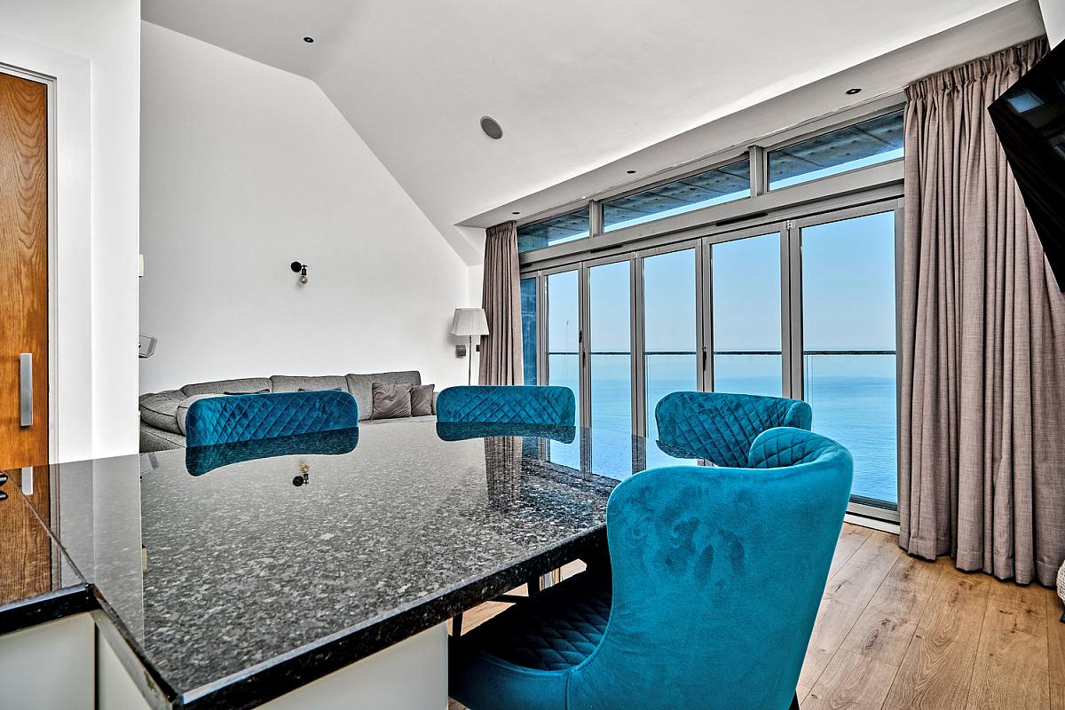 With laminate wood floor, wired for wall lighting, dimmer control panel, storage housing gas boiler and full wall sun fold doors opening onto decked area with panoramic views across Atlantic Ocean, Coast Road and Portrush.