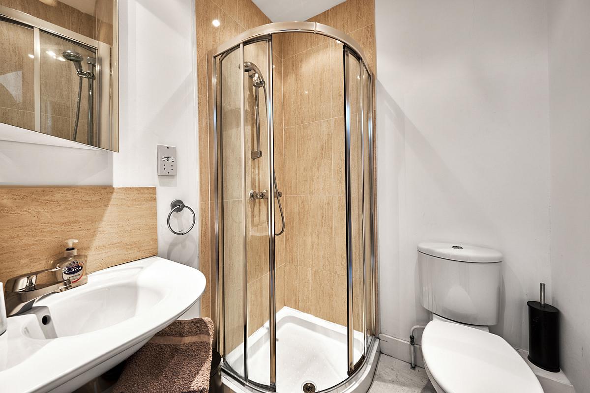 Ensuite off with w.c., wash hand basin with tiled splashback, illuminated mirror above, fully tiled walk in shower cubicle with mains shower, shaver point, recessed lighting and tiled floor