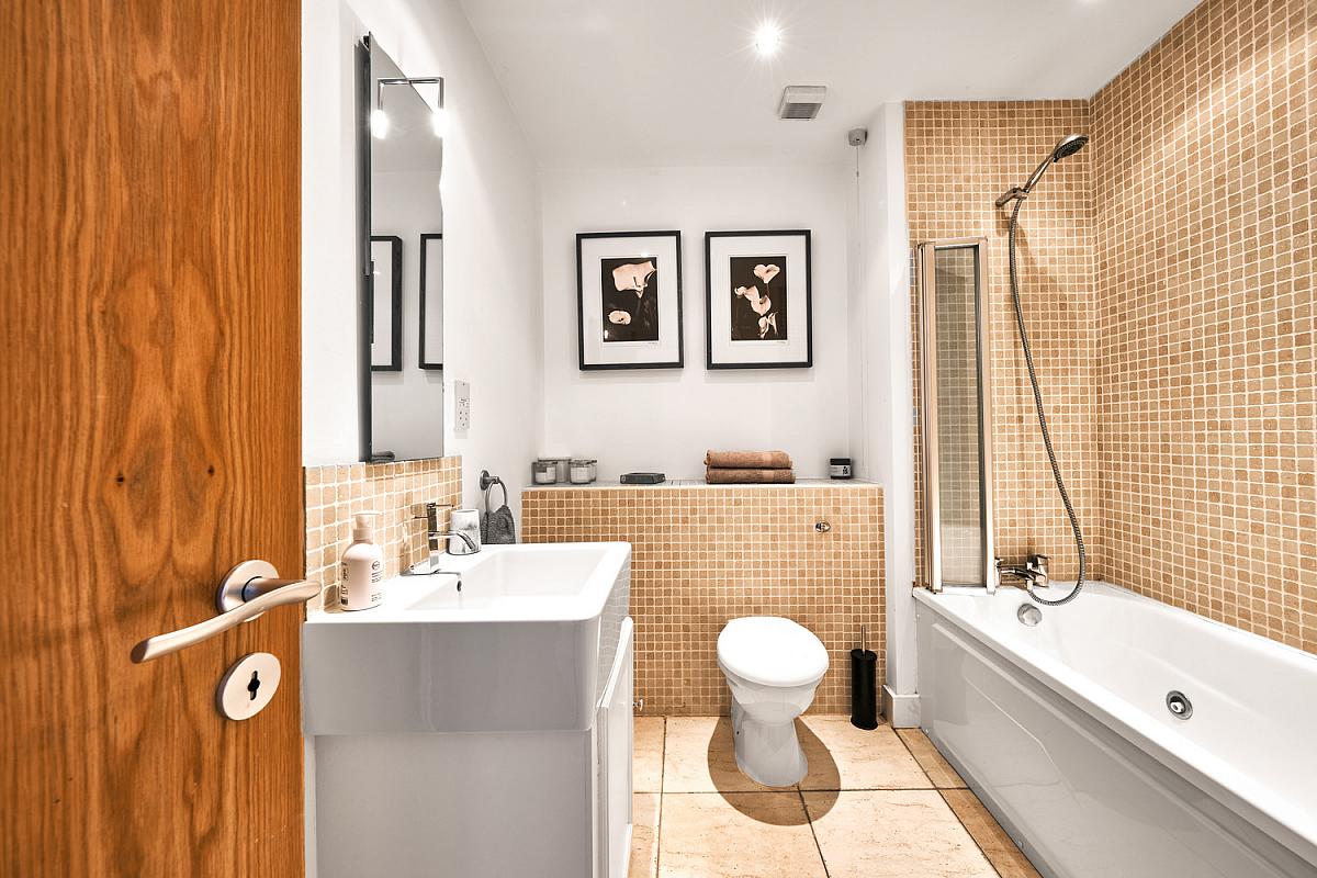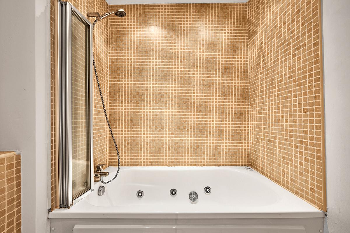 With white suite comprising w.c., wash hand basin with tiled splashback and storage below, telephone hand shower over 'Jacuzzi' style bath, part tiled walls, shaver point and light, extractor fan, recessed lighting and tiled floor.