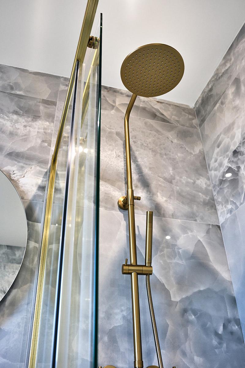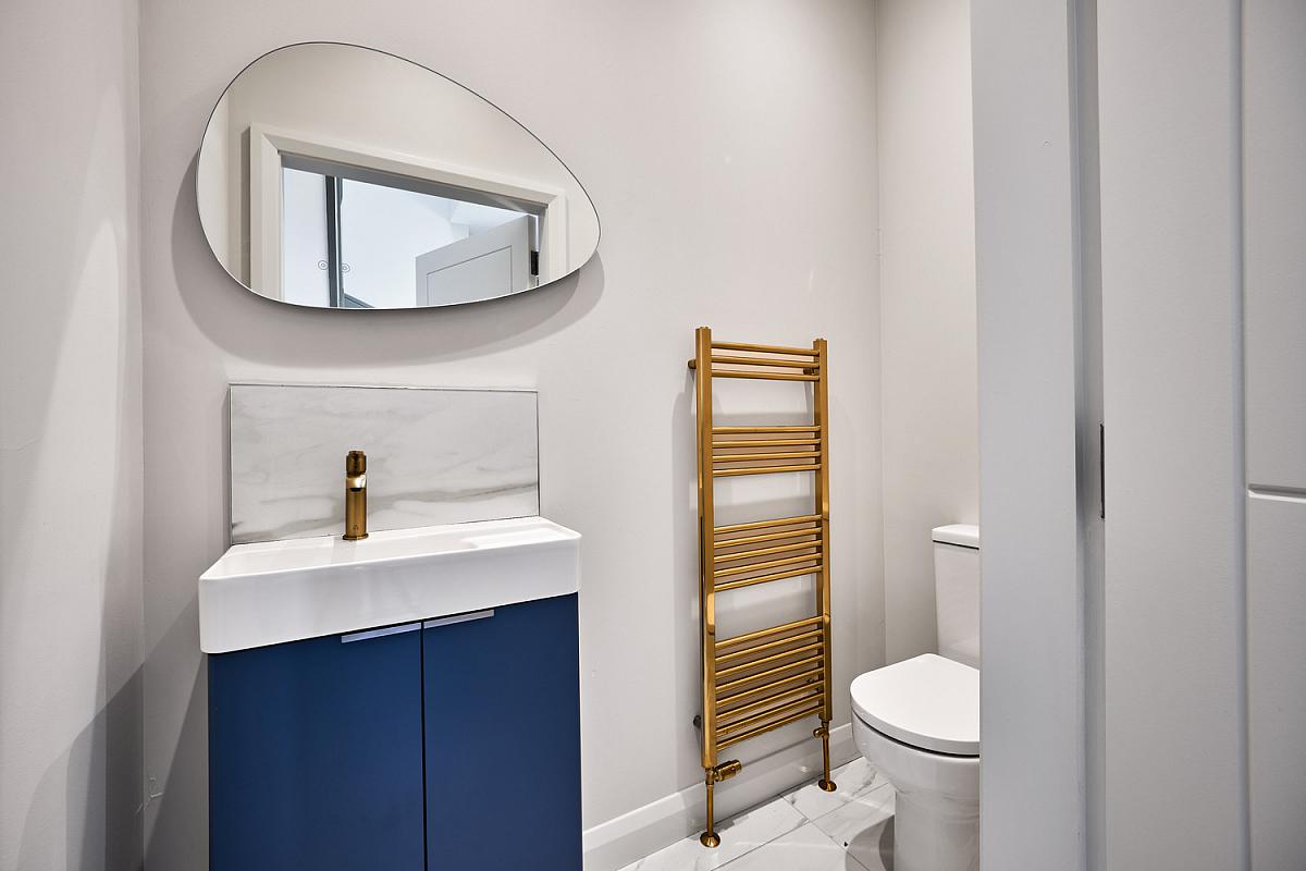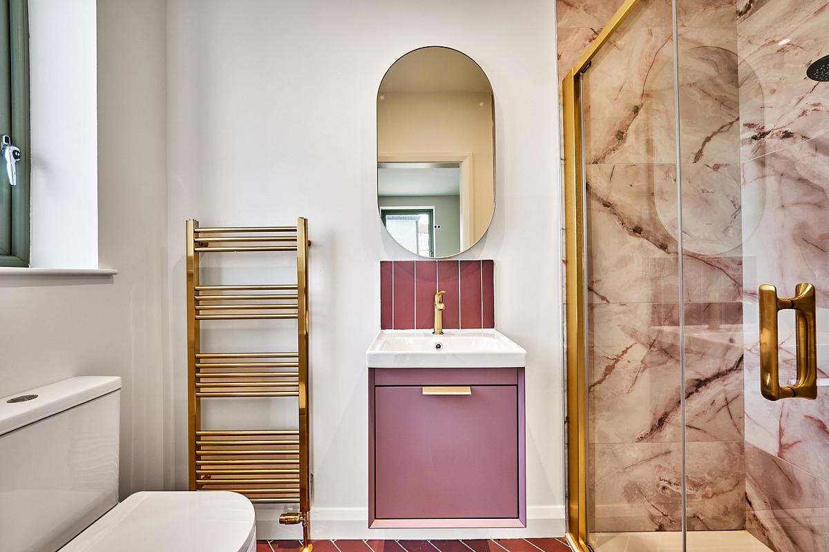 With wash hand basin with tiled splashback and storage below, brass heated towel rail, extractor fan, recess lighting and tiled floor.