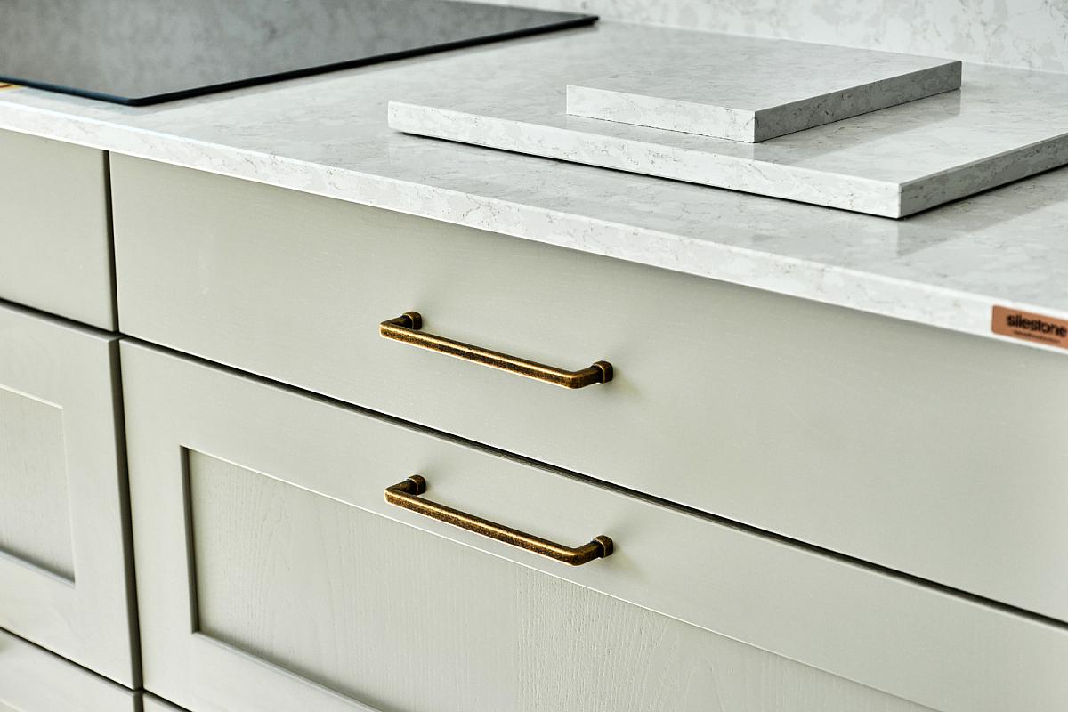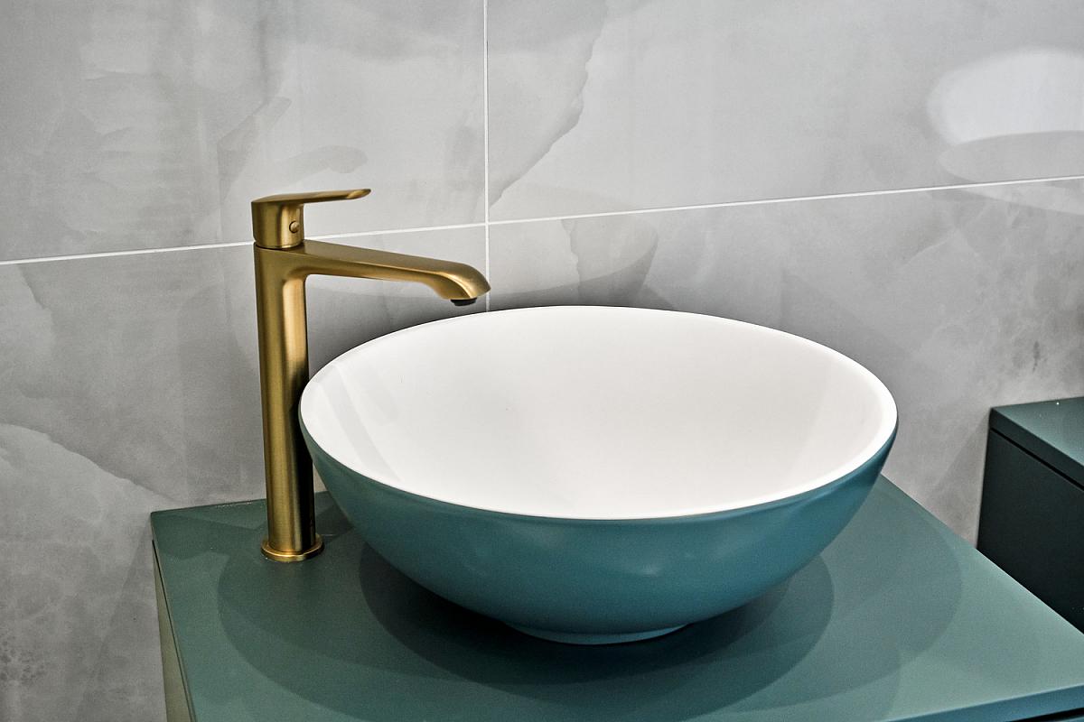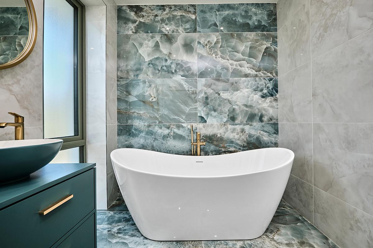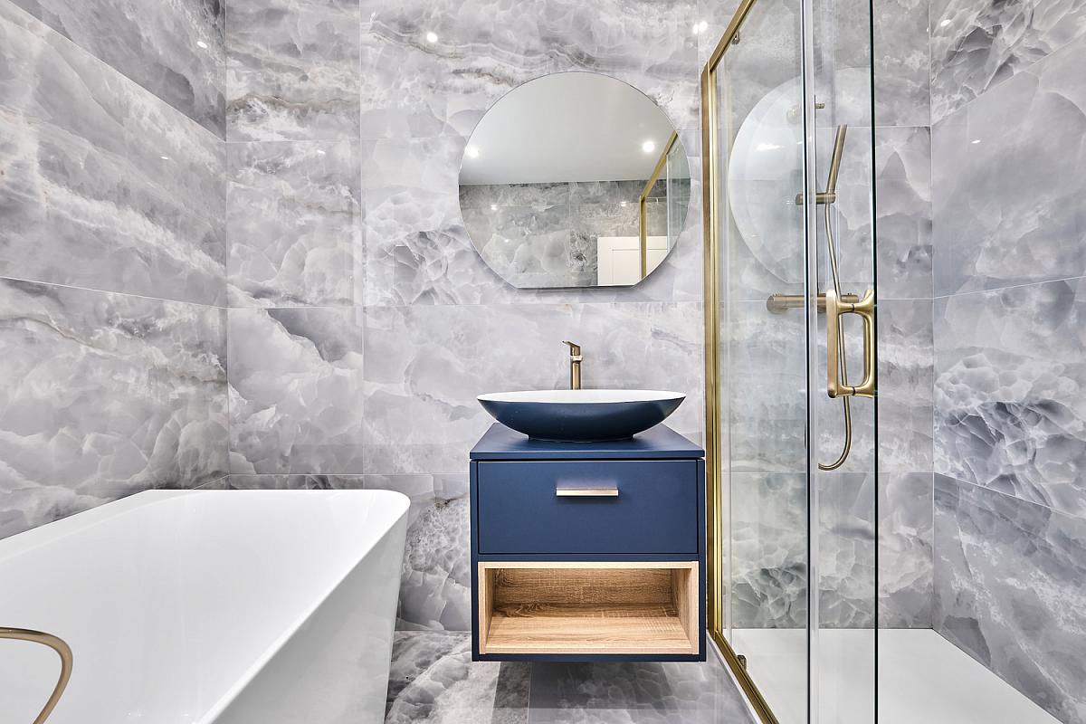 With wash hand basin with tiled splashback and storage below, brass heated towel rail, extractor fan, recess lighting and tiled floor.