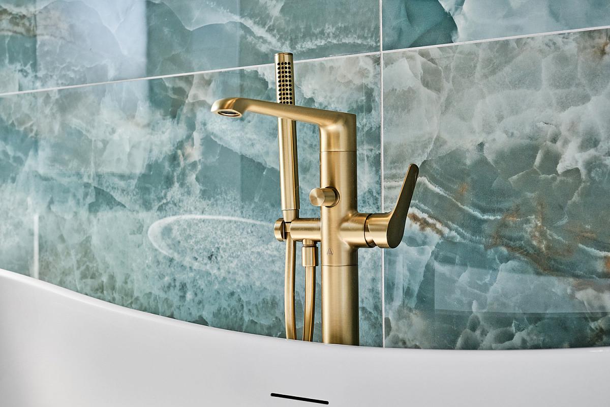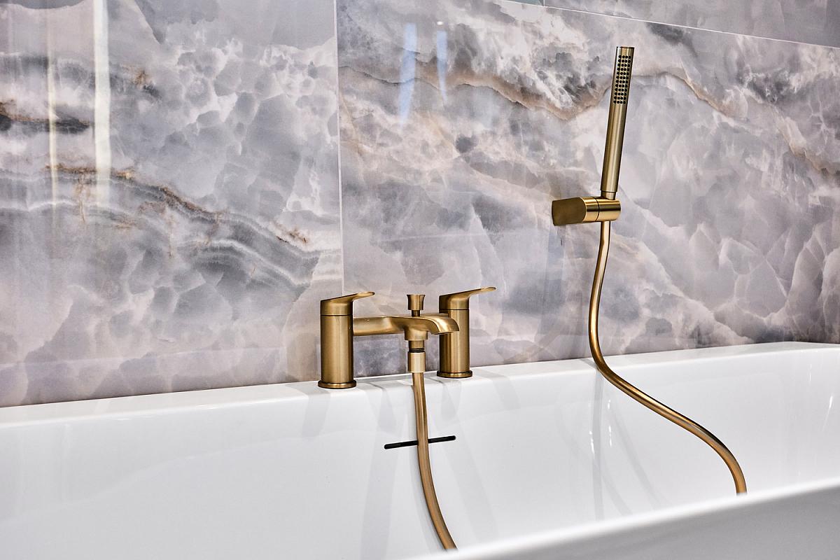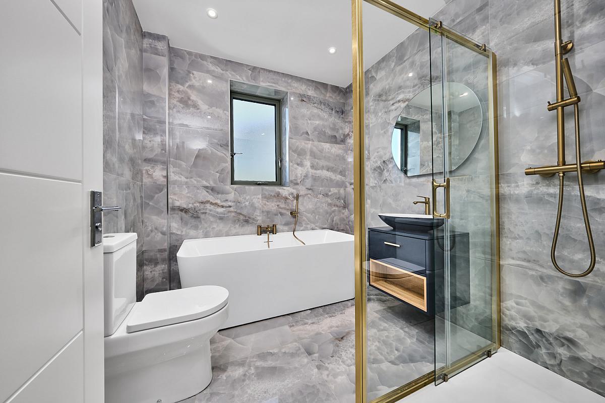 With white suite comprising w.c., circular wash hand basin set in vanity unit with storage below and illuminated mirror above, fully tiled walk in shower cubicle with mains rainfall shower head and additional telephone hand shower, brass telephone hand shower over freestanding bath, brass heated towel rail, extractor fan, fully tiled walls and tiled floor.