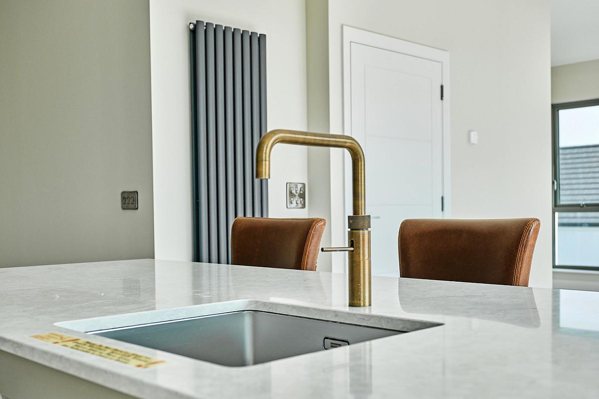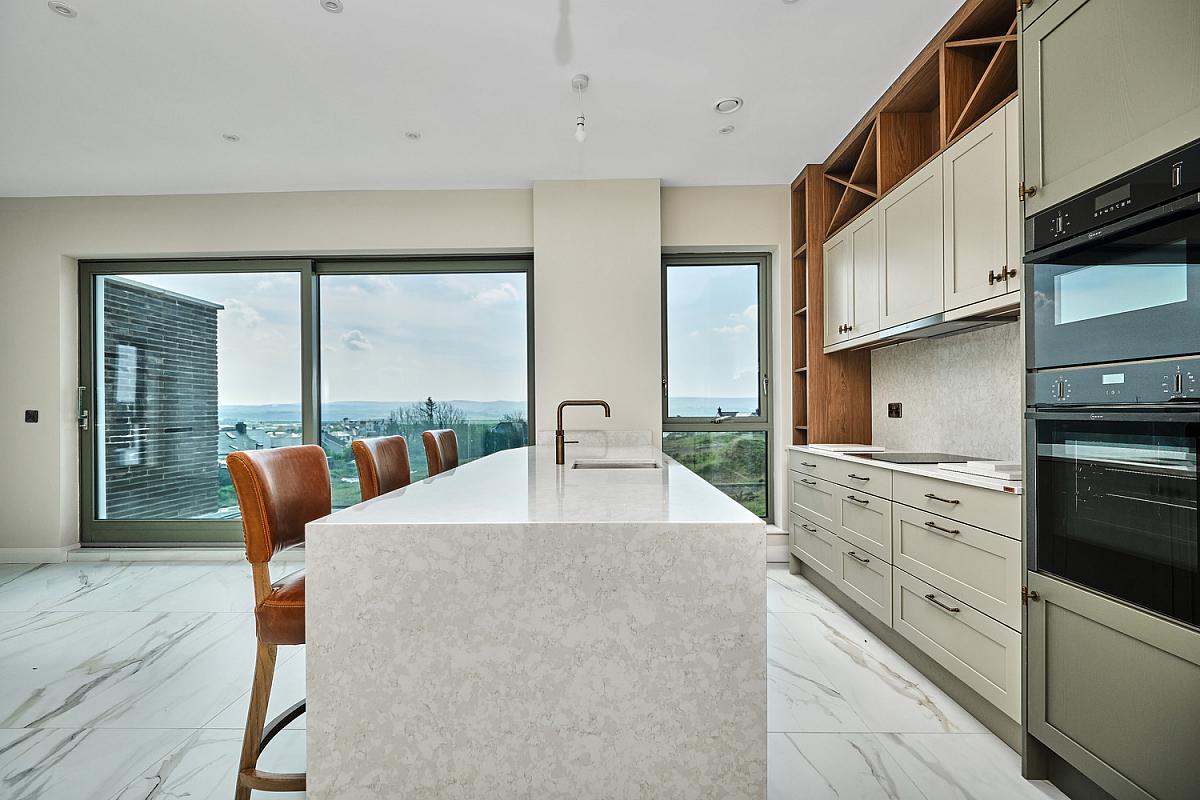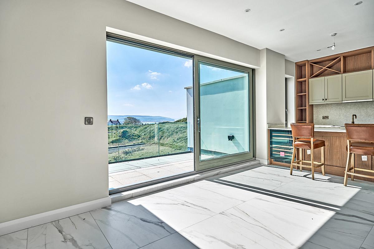 With stainless steel 'Franke' sink unit with brass 'Quooker' tap set in 'Silestone' worktop, high and low level built in units with tiling between, integrated 'NEFF' ceramic hob, concealed 'NEFF' extractor fan above with 'Silestone' splashback, 'NEFF' integrated fridge freezer, double eye level 'NEFF' ovens, integrated dishwasher, concealed bins, saucepan drawers, built in storage cupboard, shelving and over head storage, larder cupboard, extensive breakfast bar with wood feature comprising wine fridge and seating for multiple people, recessed lighting, vertical radiator, thermostat controls, tiled floor and sliding patio doors leading to paved balcony area with views across Portstewart Strand, Mussenden Temple, Atlantic Ocean and Donegal Headlands.