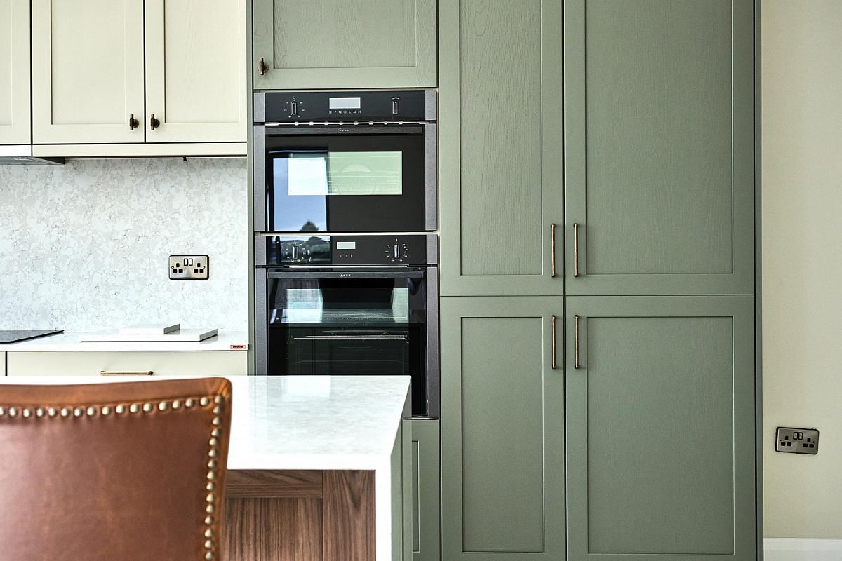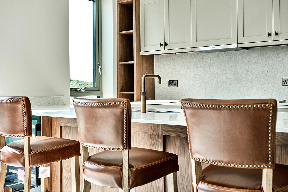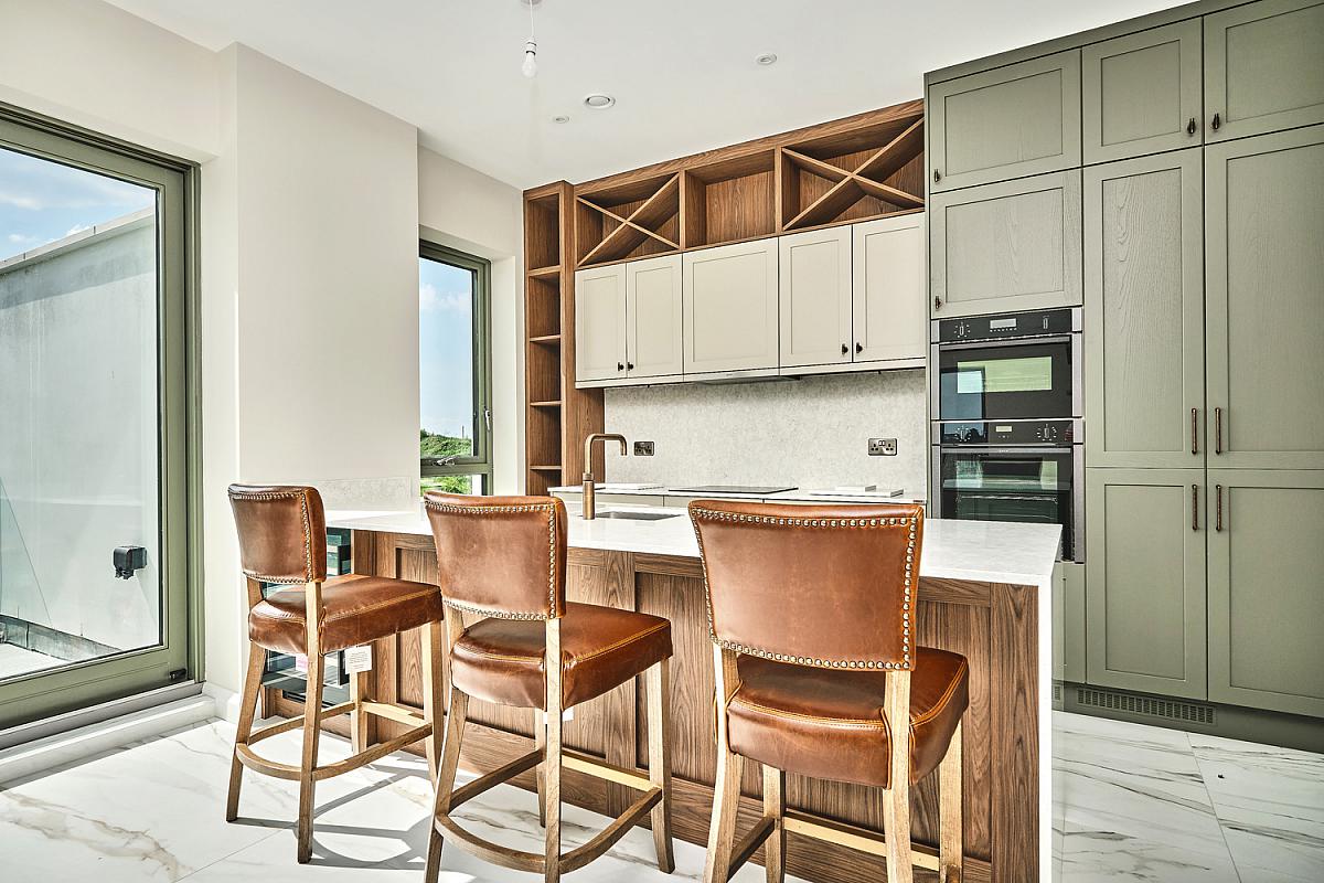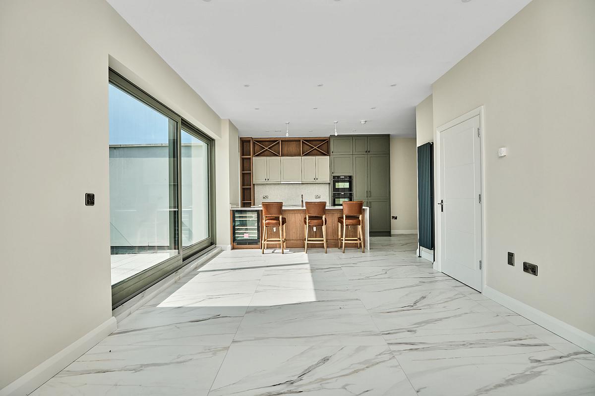 With stainless steel 'Franke' sink unit with brass 'Quooker' tap set in 'Silestone' worktop, high and low level built in units with tiling between, integrated 'NEFF' ceramic hob, concealed 'NEFF' extractor fan above with 'Silestone' splashback, 'NEFF' integrated fridge freezer, double eye level 'NEFF' ovens, integrated dishwasher, concealed bins, saucepan drawers, built in storage cupboard, shelving and over head storage, larder cupboard, extensive breakfast bar with wood feature comprising wine fridge and seating for multiple people, recessed lighting, vertical radiator, thermostat controls, tiled floor and sliding patio doors leading to paved balcony area with views across Portstewart Strand, Mussenden Temple, Atlantic Ocean and Donegal Headlands.