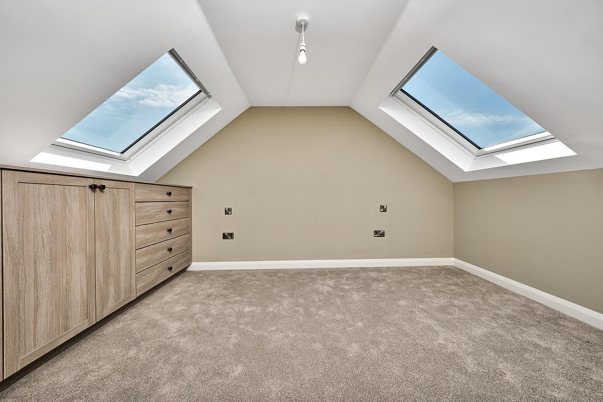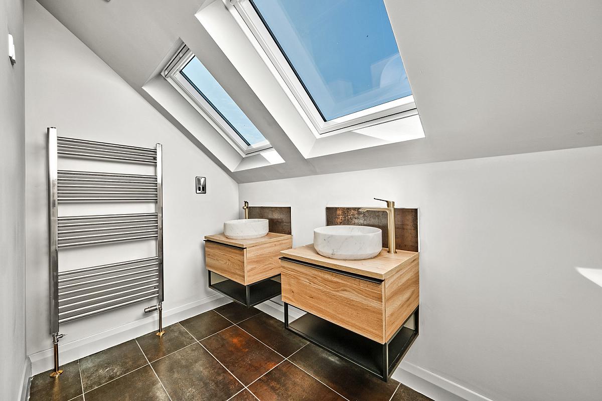 Ensuite off with w.c., floating his and hers circular wash hand basin set in vanity unit, large fully tiled walk in shower cubicle with brass rainfall shower head and additional telephone hand shower, heated towel rail, shelving, extractor fan, recessed lighting, three 'Velux' windows and tiled floor.