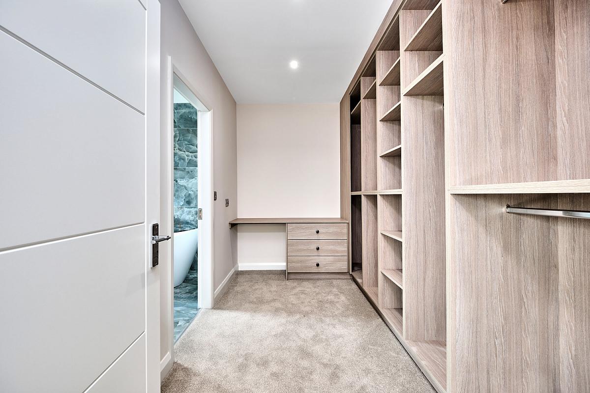With fitted open plan wardrobes with rails, shelving, dressing table and chest of drawers