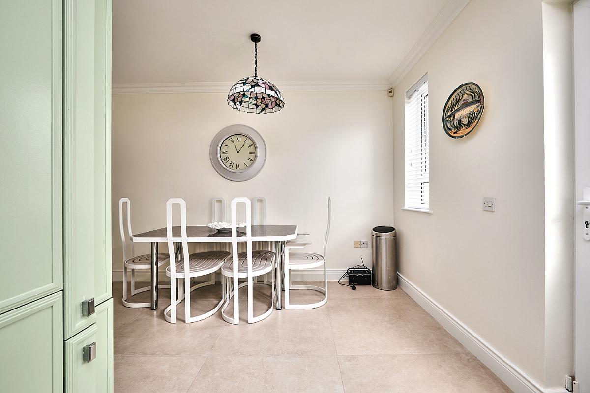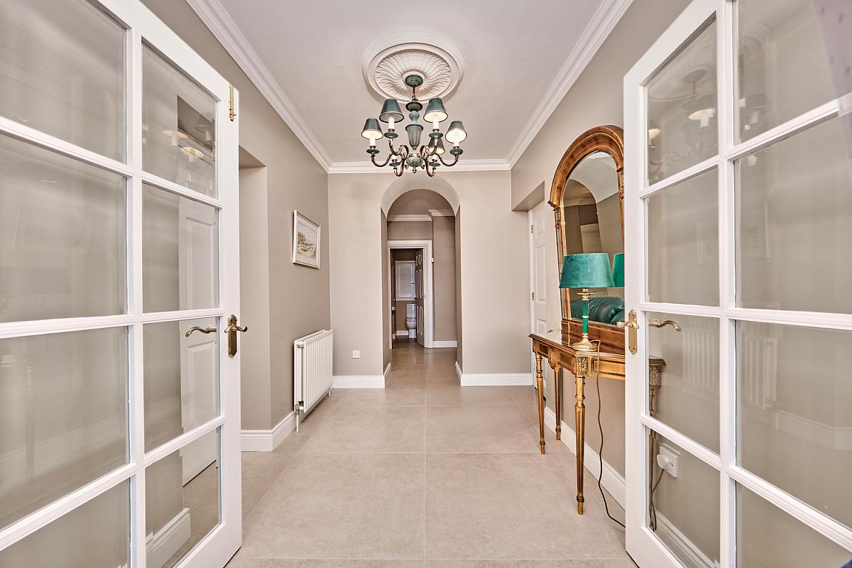 With pane panel glass door and panels to side from hallway, bowl and half single drainer stainless steel sink unit, high and low level built in units, integrated ceramic hob, double oven, integrated fridge freezer and dishwasher, plumbed for automatic washing machine, shelving, tiled floor, cornicing and PVC pedestrian door to rear paved area. (L-Shaped)