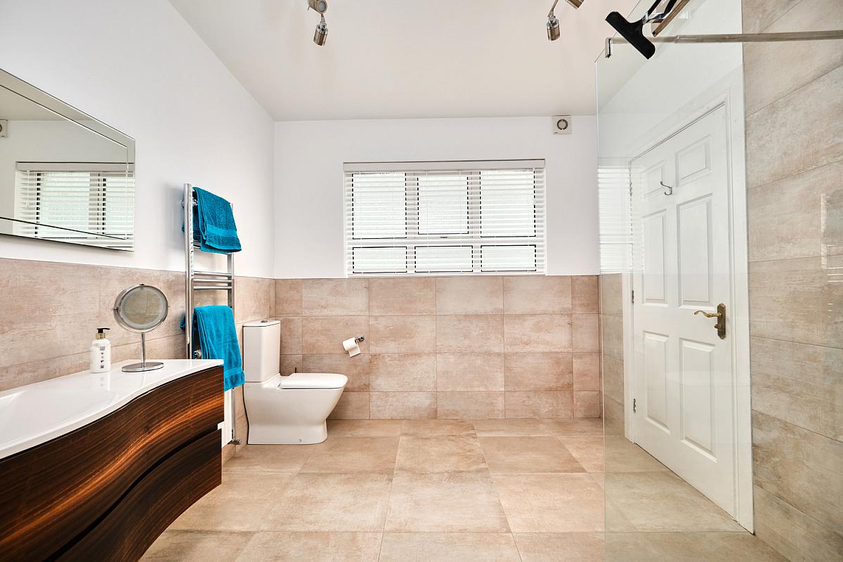 With w.c., wash hand basin set in vanity unit with storage below, fully tiled large walk in shower area with electric shower, half tiled walls, heated towel rail, extractor fan and tiled floor.