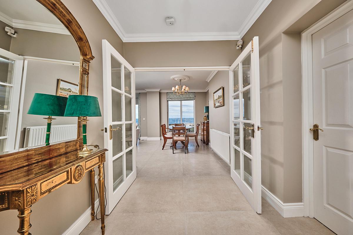 With marble surround fireplace with marble inset and heart, cornicing, centrepieces, recessed lighting in bay, tiled floor and PVC pedestrian door leading to paved patio with panoramic views across Atlantic Ocean, Donegal Headlands, The Crescent and Portstewart Promenade. (into bay)