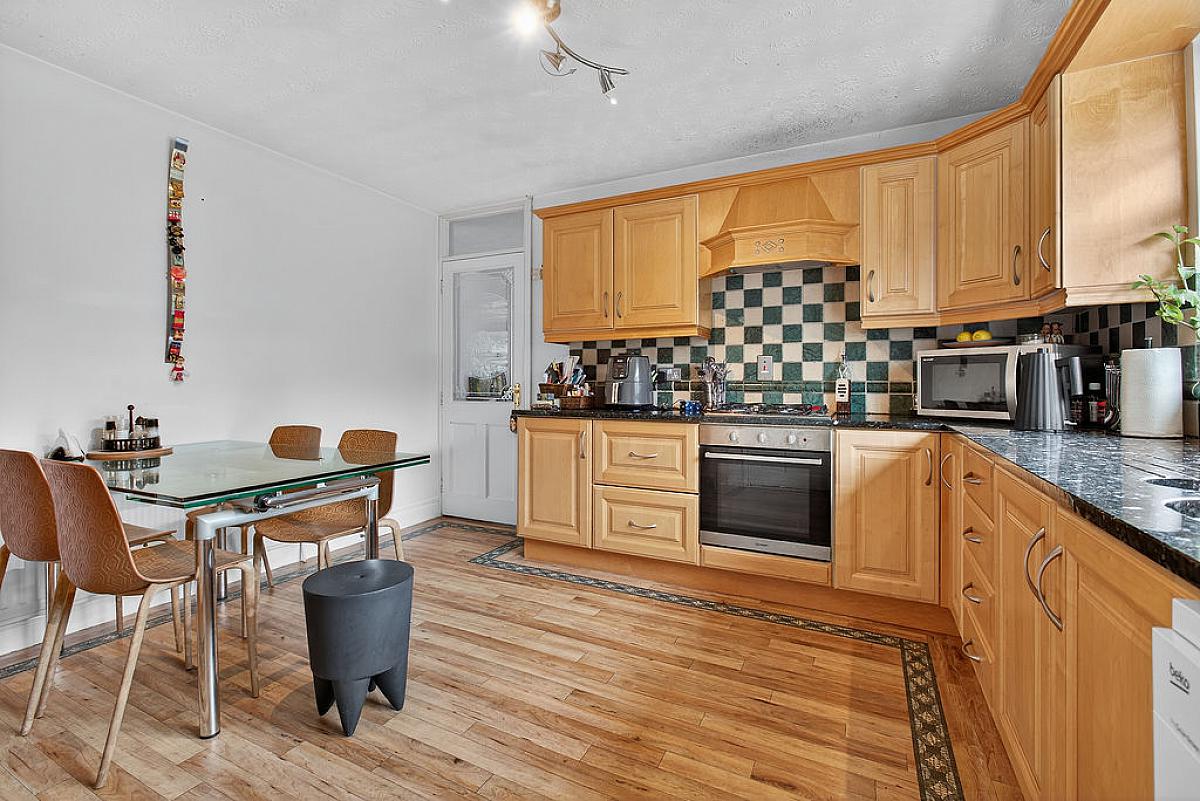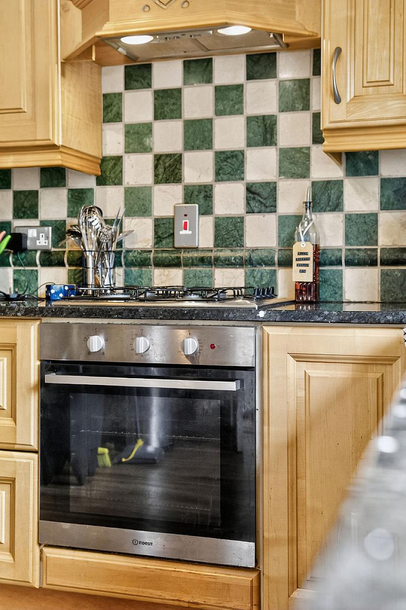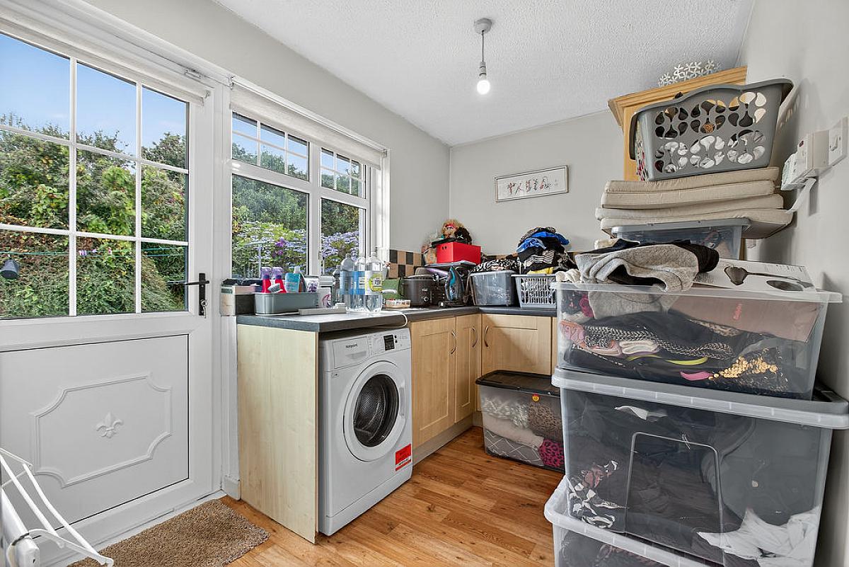 With single drainer stainless steel sink unit, high and low level units with tiling between, plumbed for automatic washing machine, solid wood floor and pedestrian door to rear and pedestrian door to integral garage.