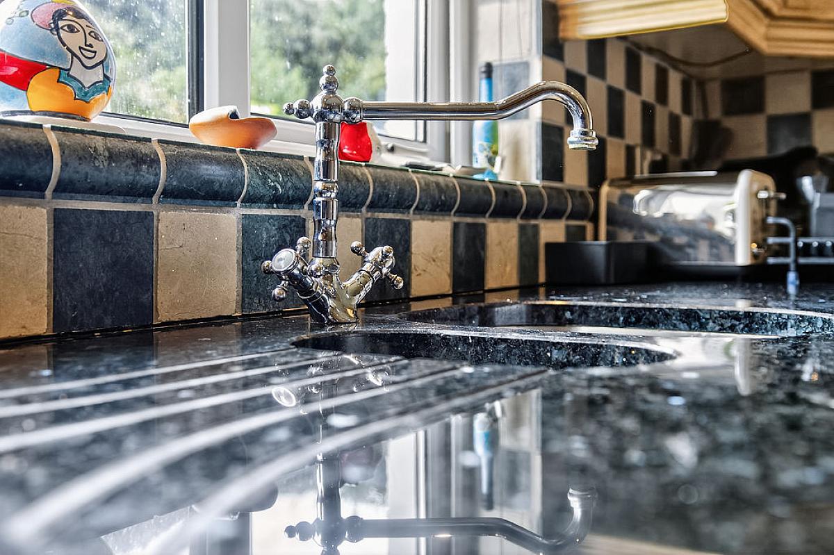 With bowl and half single drainer stainless steel sink unit set in granite worktop, high and low level units with tiling between, integrated gas hob, oven, extractor fan above, fridge, plumbed for automatic dish washer, illuminated glass display cabinets with rack, recessed lighting in pelmets and 'Amtico' flooring.