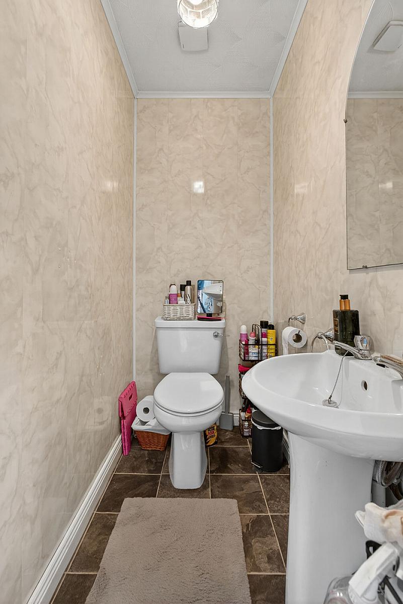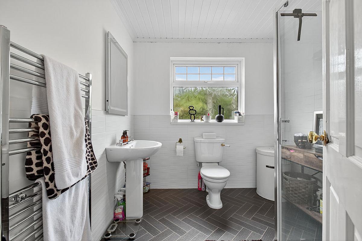 With white suite comprising w.c., wash hand basin, fully tiled walk in shower cubicle with electric shower, heated towel rail, PVC sheeted ceiling, half tiled walls and extractor fan.