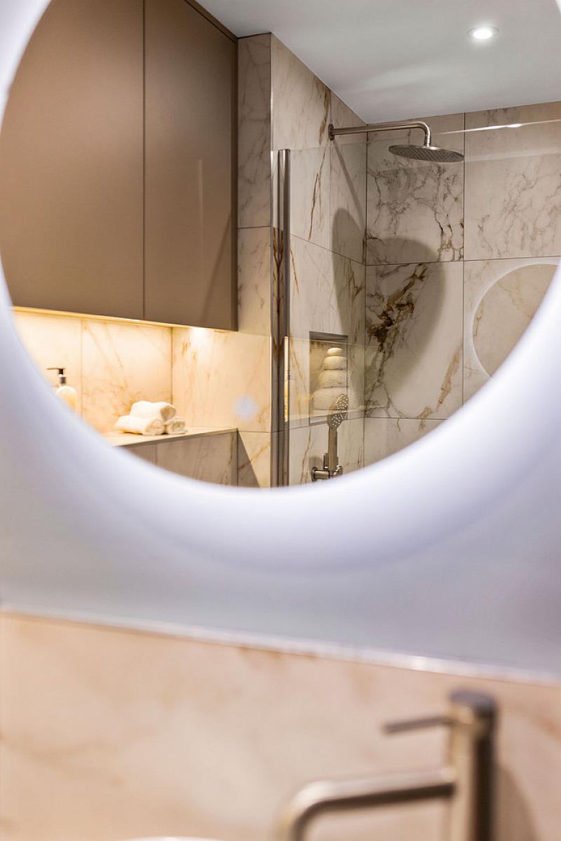 Ensuite off with floating w.c. with brushed chrome flush plate, round countertop wash hand basin set in vanity unit with illuminated mirror above and tiled splashback, fully tiled walk in shower cubicle with mains shower head and additional telephone hand shower, low profile shower tray, overhead storage units with recessed lights below, recessed shelving in tiled walls, extractor fan, recessed lighting and tiled floor.