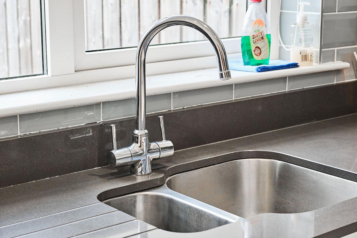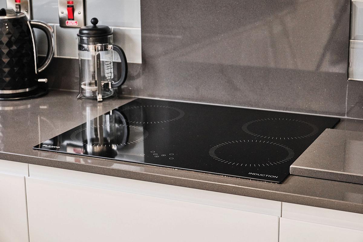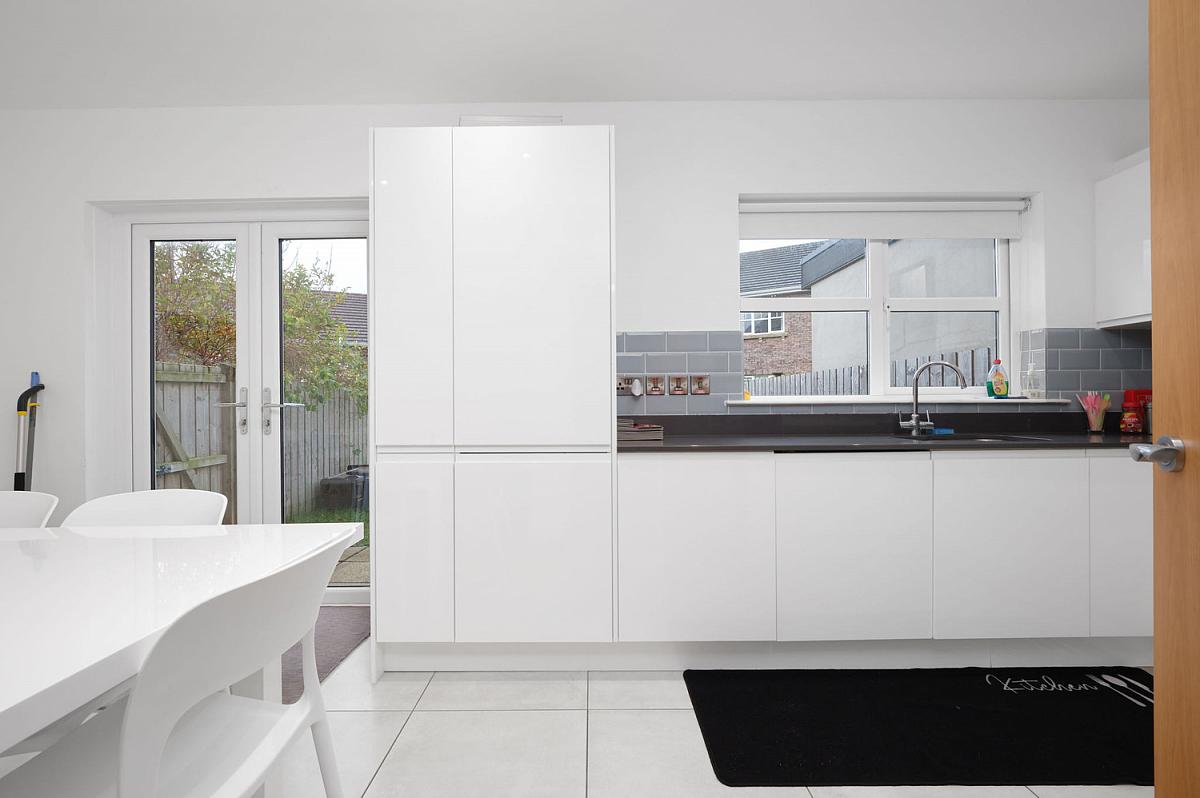 With bowl and half single drainer stainless steel sink unit set in granite worktops and upstands, integrated induction hob with granite splashback, extractor fan above, double eye level oven, integrated dishwasher and fridge freezer, recessed lighting, tiled floor and PVC French doors leading to rear garden.