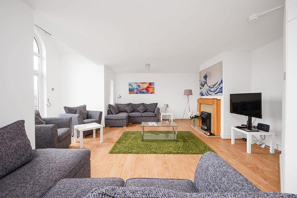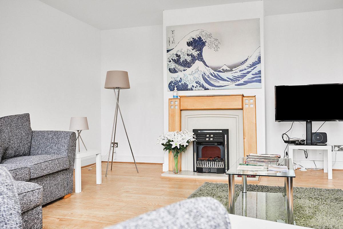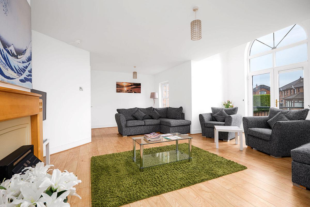 With pine surround fireplace, laminate woo d floor and PVC French doors leading onto balcony with feature glass arch above.