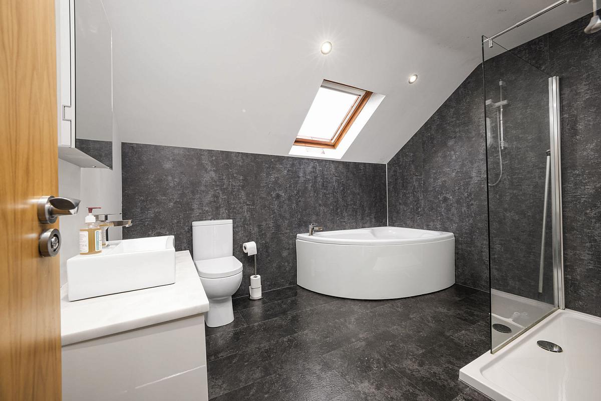 With white suite comprising w.c., wash hand basin set in vanity unit with mirrored cabinet above, large PVC cladded walk in shower area, 'Jacuzzi' style bath, heated towel rail, PVC cladded walls, recessed lighting, extractor fan, 'Velux' window and cladded floors.