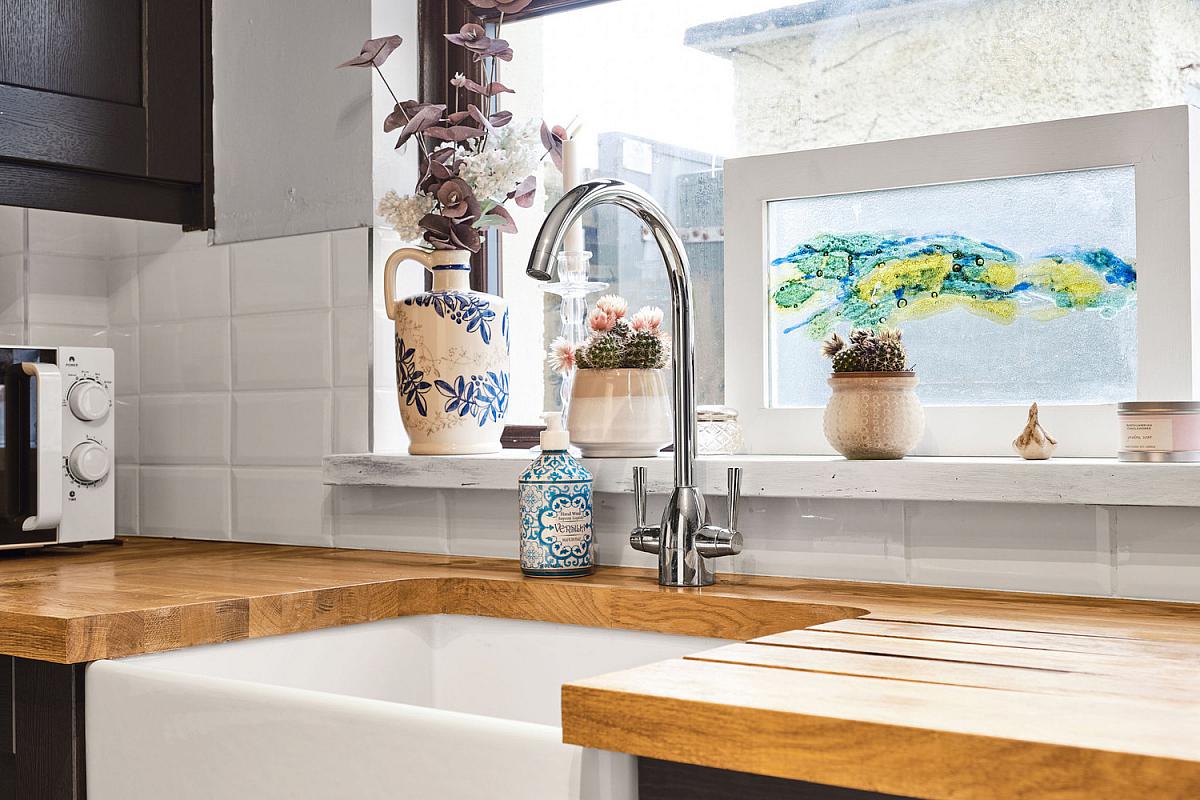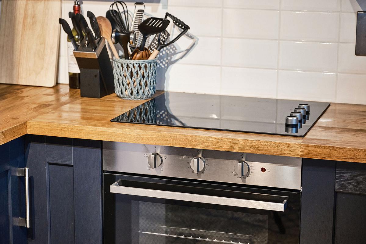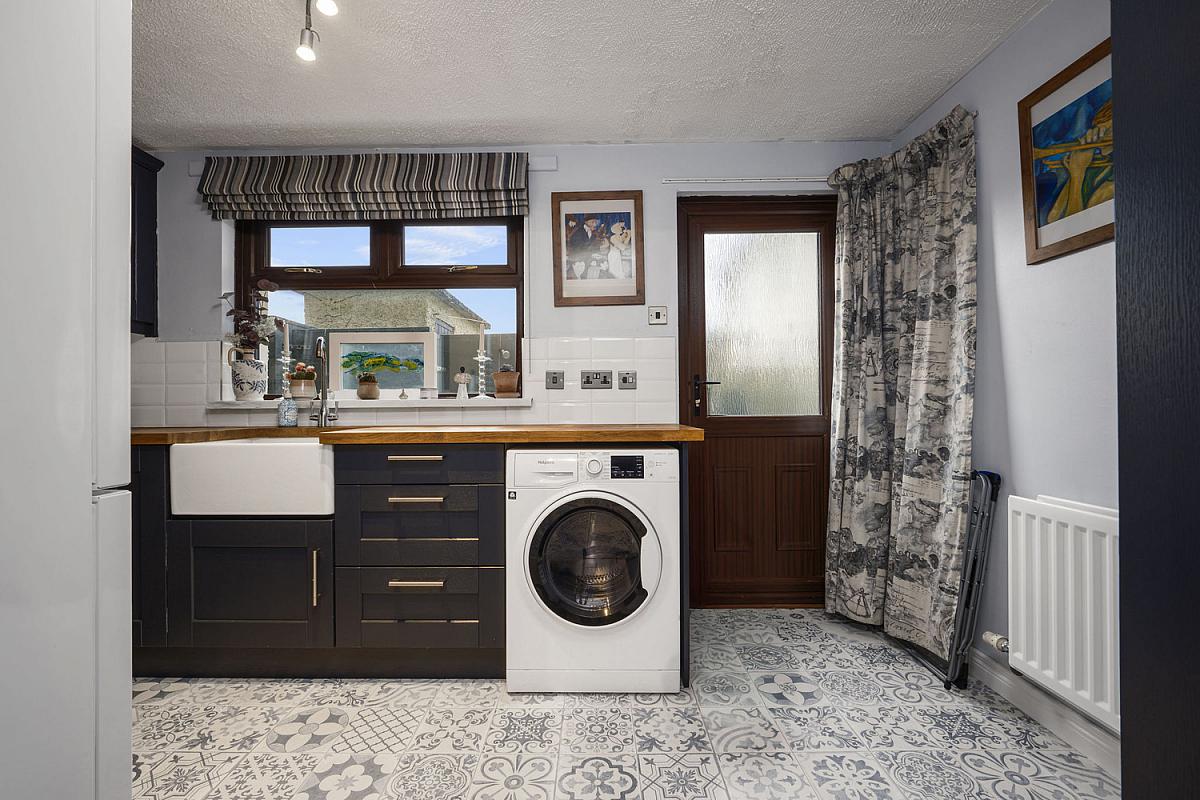 With Belfast sink unit set in wood worktop, high and low level built in units with tiling between, integrated ceramic hob and oven, space for fridge freezer, plumbed for automatic washing machine, saucepan drawers, large shelved cupboard and tiled floor.
