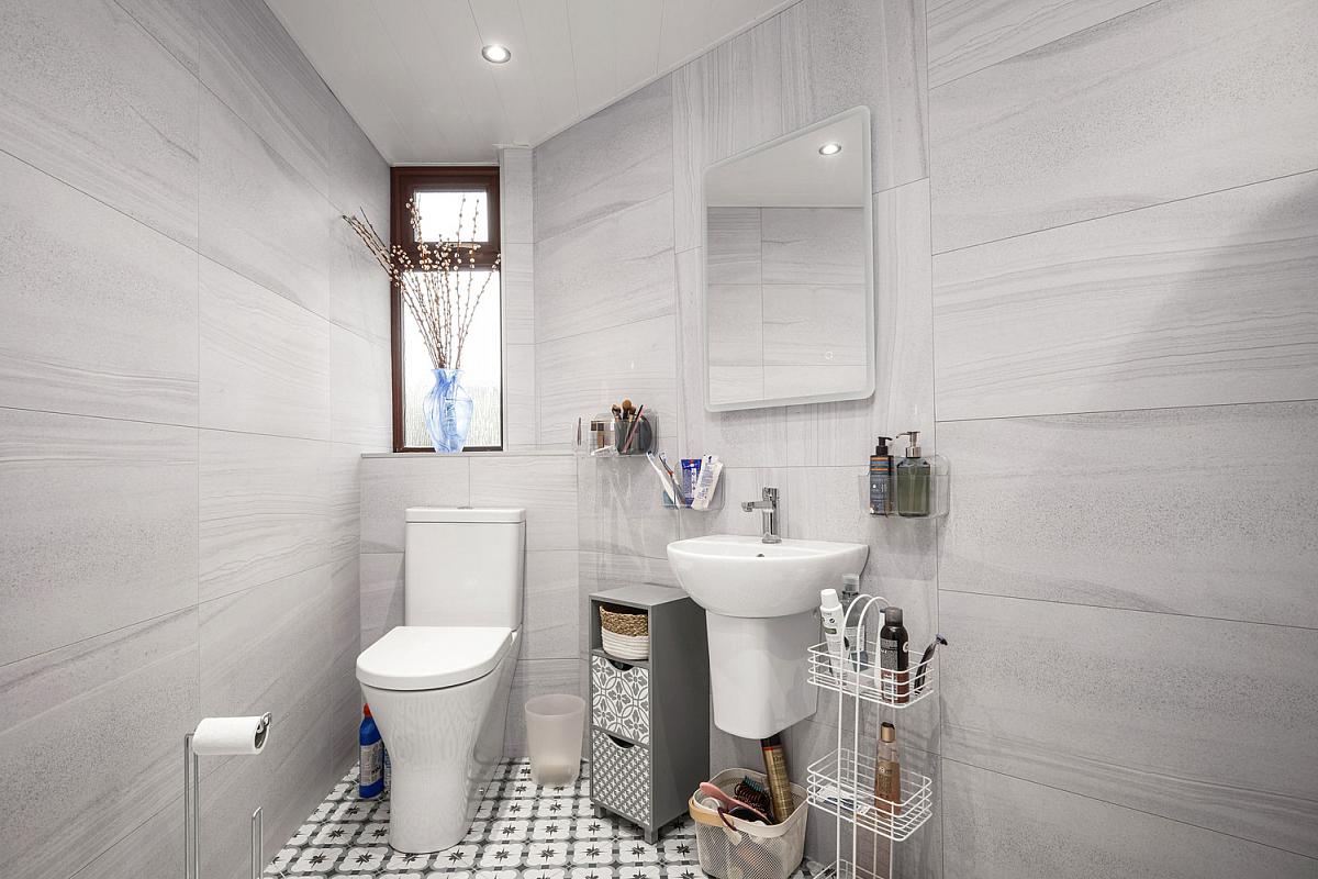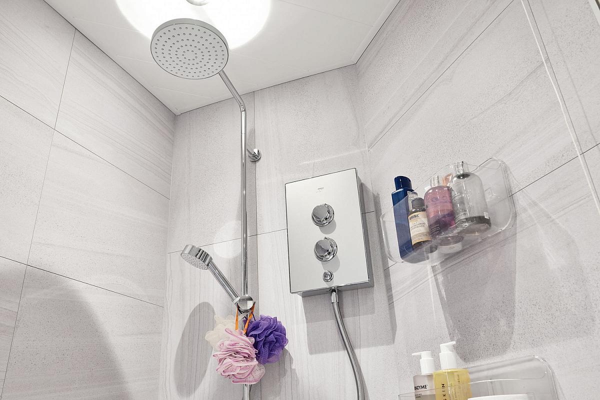 With white suite comprising w.c., floating wash hand basin with illuminated mirror above, rainfall shower head with additional telephone electric shower area, fully PVC sheeted and sealed walls, recessed lighting in PVC sheeted ceiling and tiled floor.