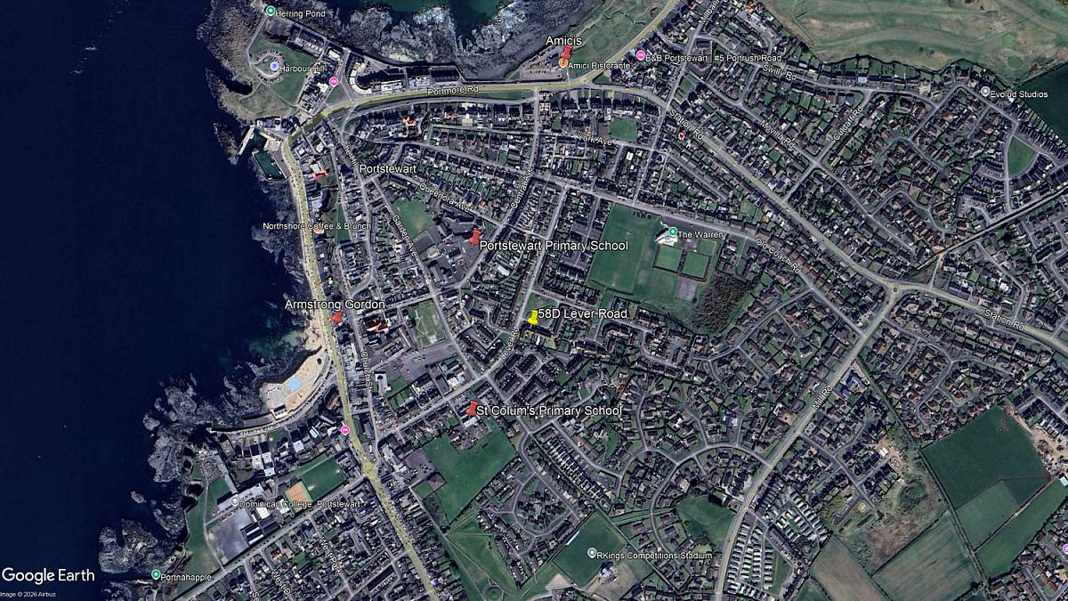 Approaching Portstewart on the Coleraine Road, take your third left at the Diamond roundabout onto the Diamond. Take your first right onto Lever Road and No 58D will be located on your right hand after Mullaghacall Road and opposite the green at Lever Park.