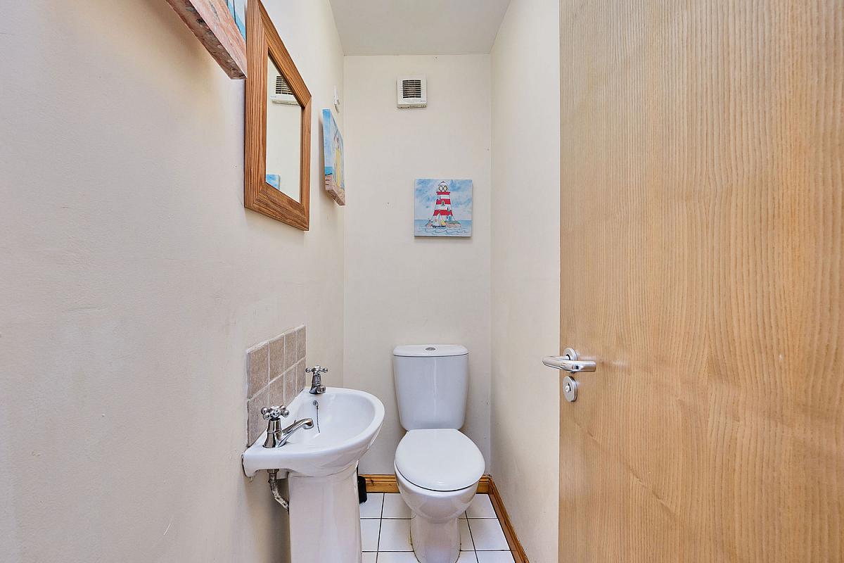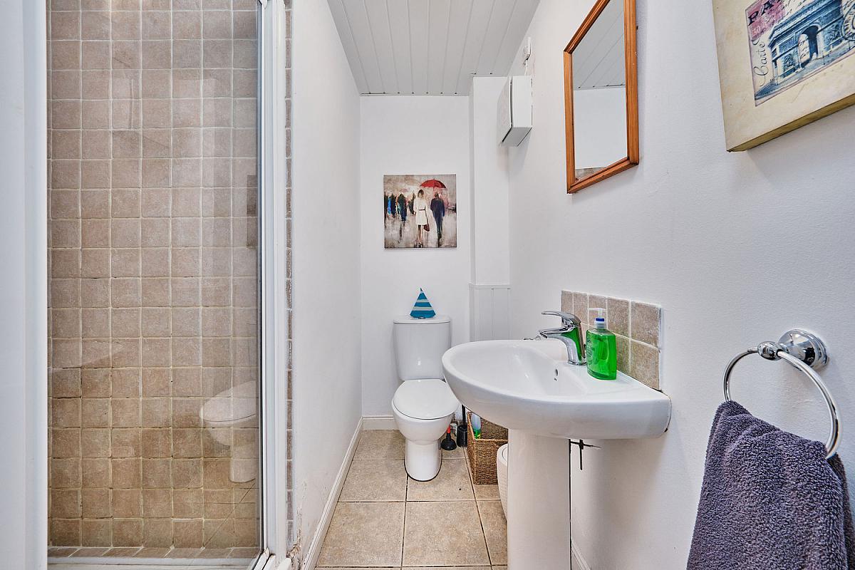 With wash hand basin, w.c., extractor fan and tiled floor.