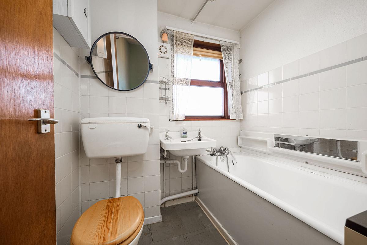 With white suite comprising w.c., wash hand basin and part tiled walls.