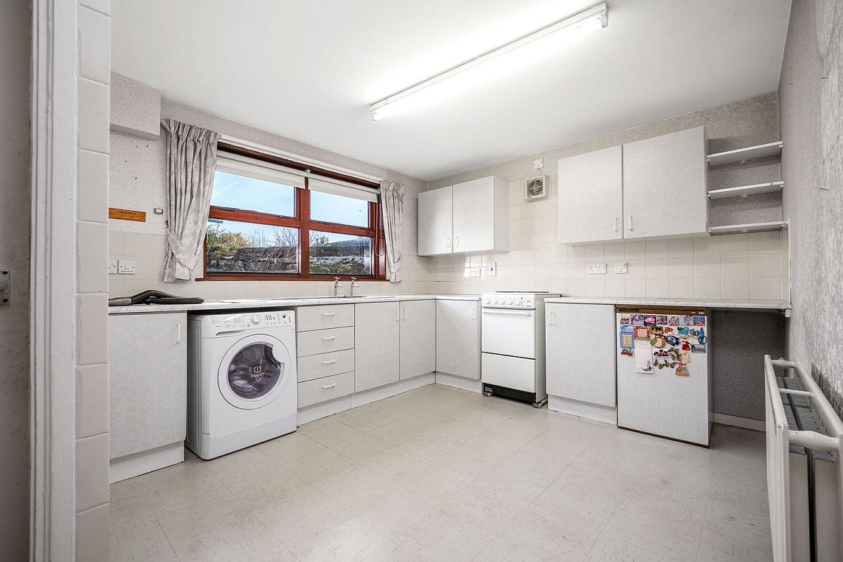 With single drainer stainless steel sink unit, high and low level built in units with tiling between, space for cooker and fridge, plumbed for automatic washing machine, drawer bank, part tiled walls, shelving and strip lighting.