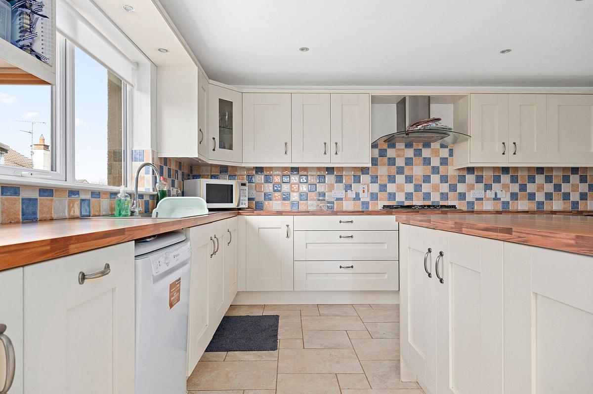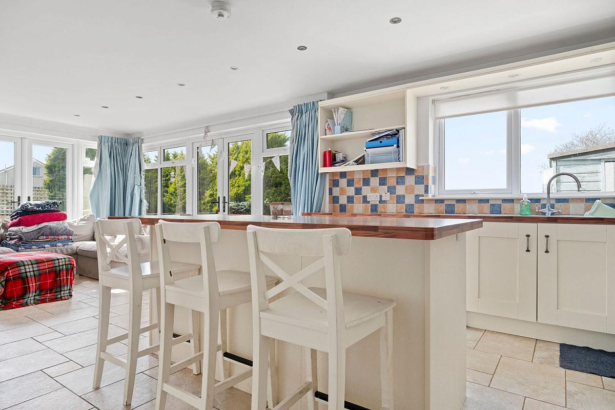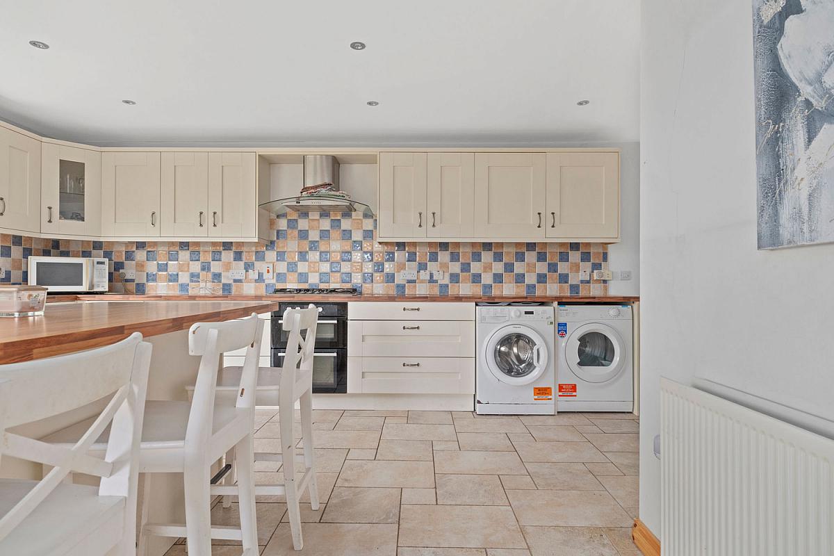 With bowl and half single drainer stainless steel sink unit, high and low level built in units with under unit lighting and tiling between, integrated gas hob, stainless steel extractor fan above, integrated double oven, plumbed for automatic washing machine, space for tumble dryer, plumbed for automatic dishwasher, glass display cabinet, saucepan drawers, space for fridge freezer, concealed bin area, matching island with storage below and seating for multiple people, shelved larder cupboard, heated towel rail, space for fridge freezer, recessed lighting, recessed lighting in pelmets, tiled floor and PVC French doors leading to rear garden.